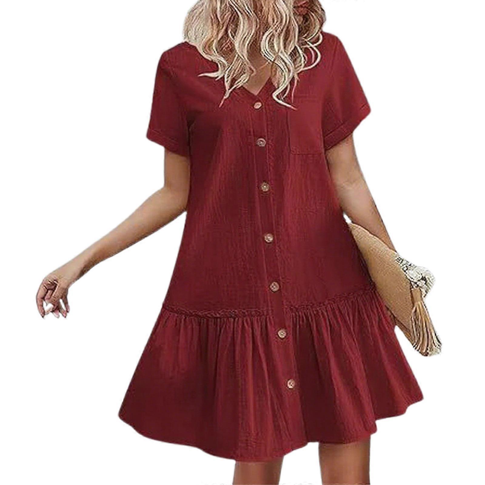 Women's Summer Dresses 2025 Short Sleeve V Neck Casual Loose Button Down Cotton Linen Dress Casual Beach Dresses Burgundy XL