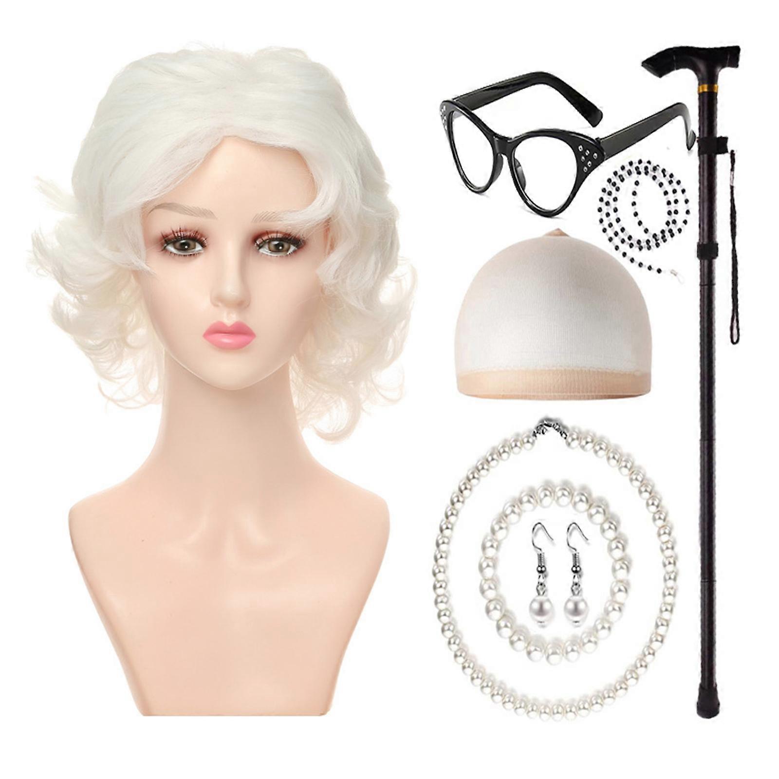 100Day of School Fancy Grannys Costume Gray Old Lady Wigs Grandmas Wigs Grannys Glasses Pearls Necklace Crutches Earring Multicolor