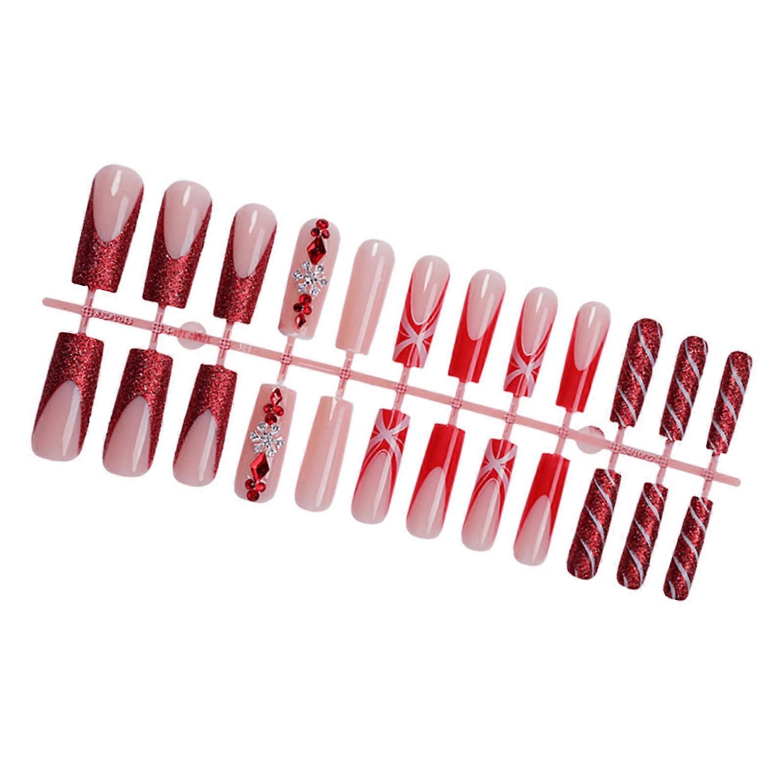 French Tip Stick On Nail Long Square Winter Nail Christmas Press on Nail Glossy False Nail Full Cover Artificial Nail Multicolor
