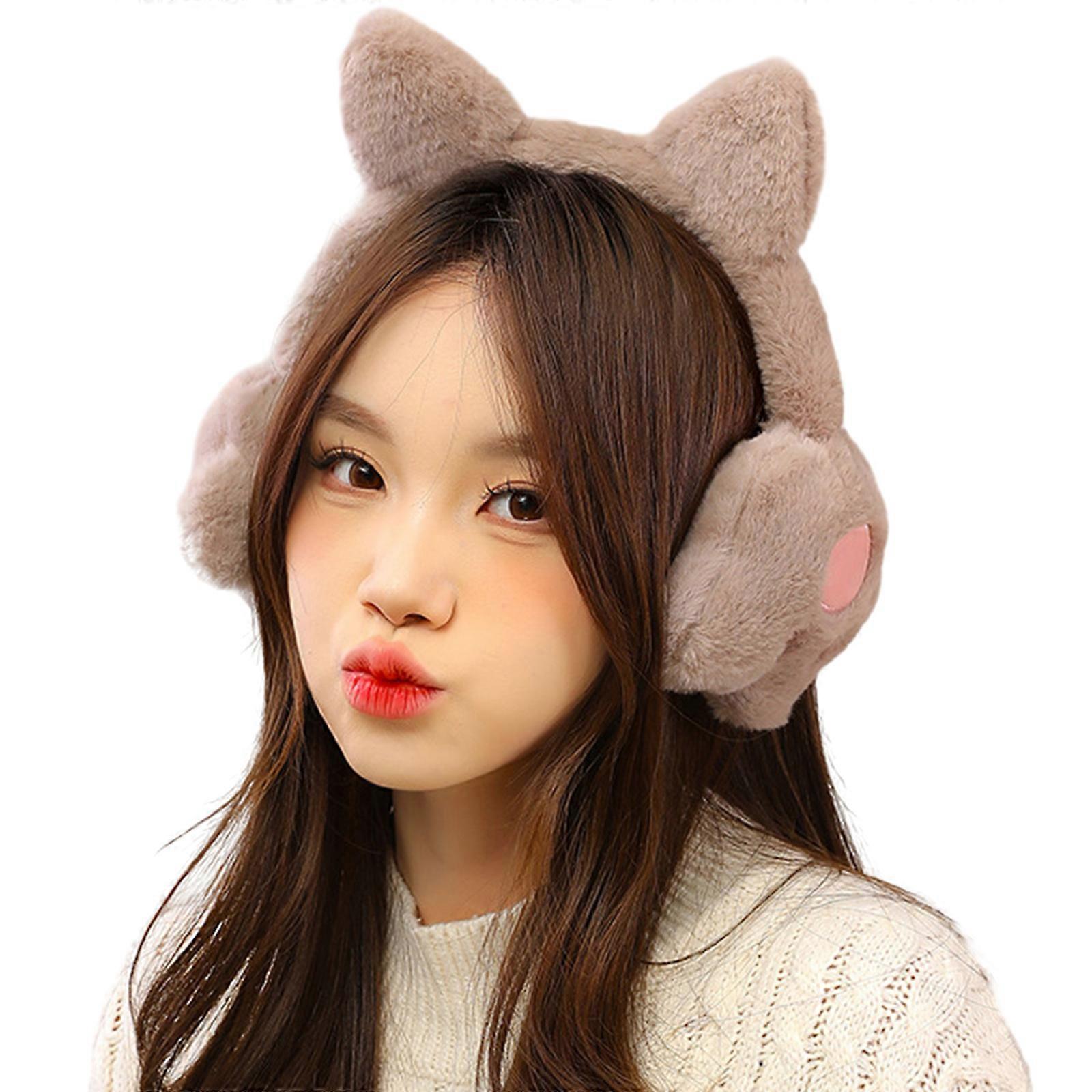 Winter Teens Plush Ear Warmer Elastic Windproof Cartoon Cat Ear Shape Earmuff Adult Winter Cycling Skiing Supplies khaki
