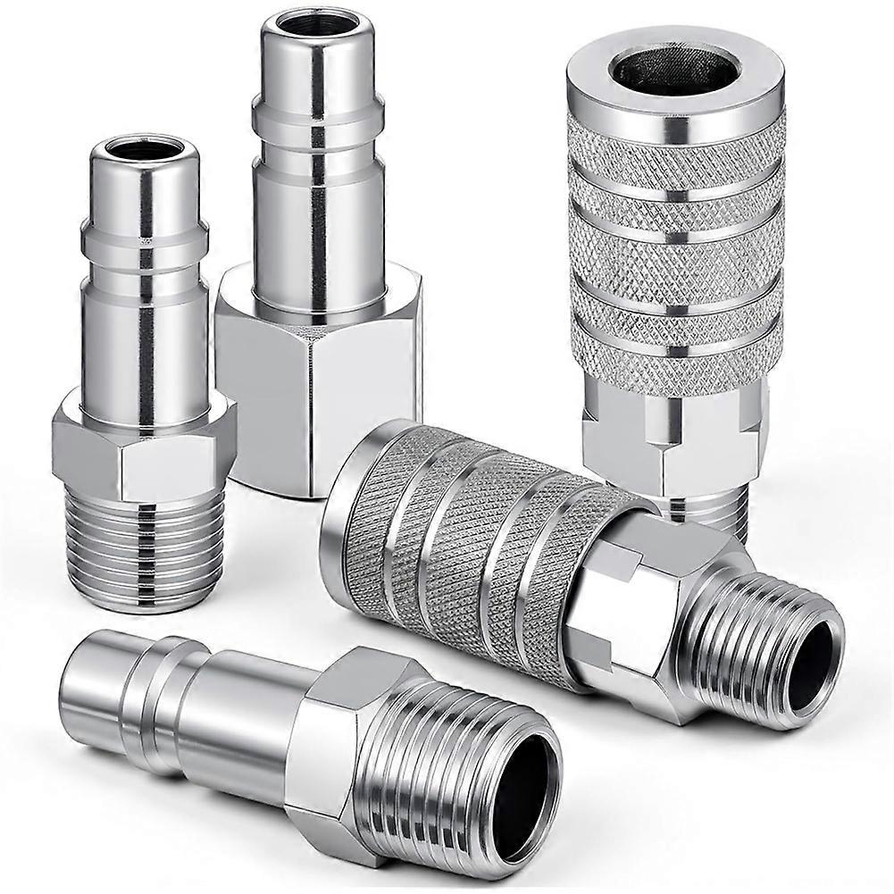 Comprehensive 5-Piece Set: Includes 2pcs 1/2 Inch I/M Industrial air coupler with male NPT threads, 1pc air plug with female NPT threads, and 2pcs air plug with male NPT threads. Check size before ordering for a perfect fit in your pneumatic setups. High-Performance Design: Engineered for demanding applications with a max working pressure of 300 PSI, temperature resistance up to 250°F, and airflow capacity from 60+ to 99 SCFM. Ideal for high-flow air tools and heavy-duty pneumatic systems. Secure Connection: Features a six-ball locking mechanism for robust connection retention and a protective sleeve guard to prevent accidental disconnections. Durable Construction: Made from heat-treated zinc-plated steel for superior corrosion resistance and longevity. Withstands harsh conditions, chemicals, and moisture, maintaining performance in demanding industrial applications. Universal Compatibility: Adheres to the 1/2" I/M industrial standard for broad interoperability with various brands. NPT thread design ensures secure sealing with thread tape, suitable for diverse workshops, garages, and pneumatic systems. Color: Silver Material: Metal Package Contents: 1 set of connector accessories