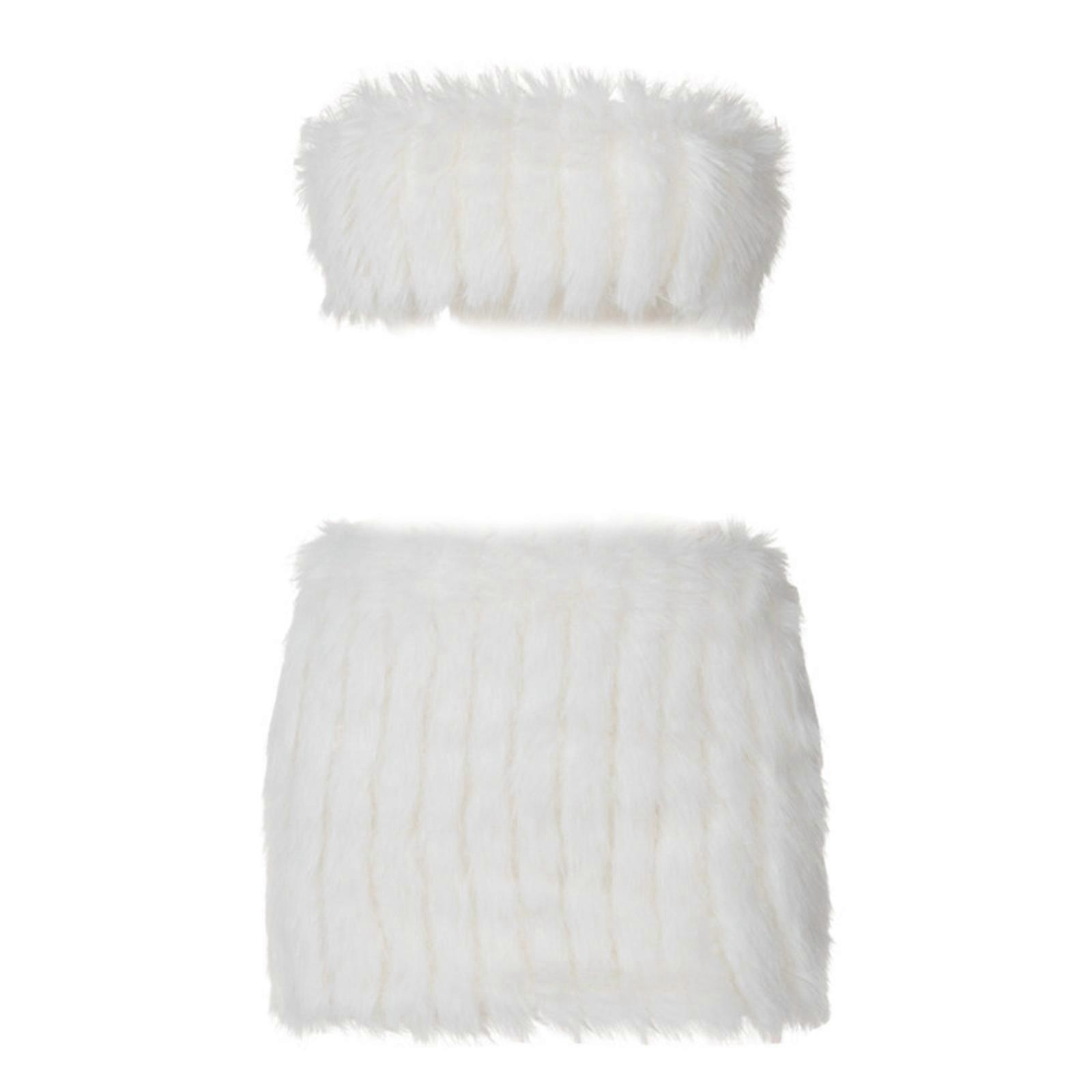 Faux Furs Strapless Crop Tube Top and Bodycon Mini Wrap Skirt Set for Women Nightclub Party Wear 2Pcs Furry Plush Outfit White S