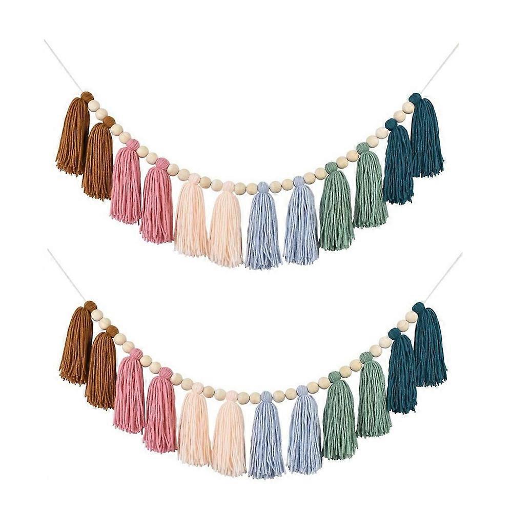 2PCS Rainbow Boho Tassel Garland with Wood Beads Colorful Wall Hanging Garland Party Baby Shower Decor