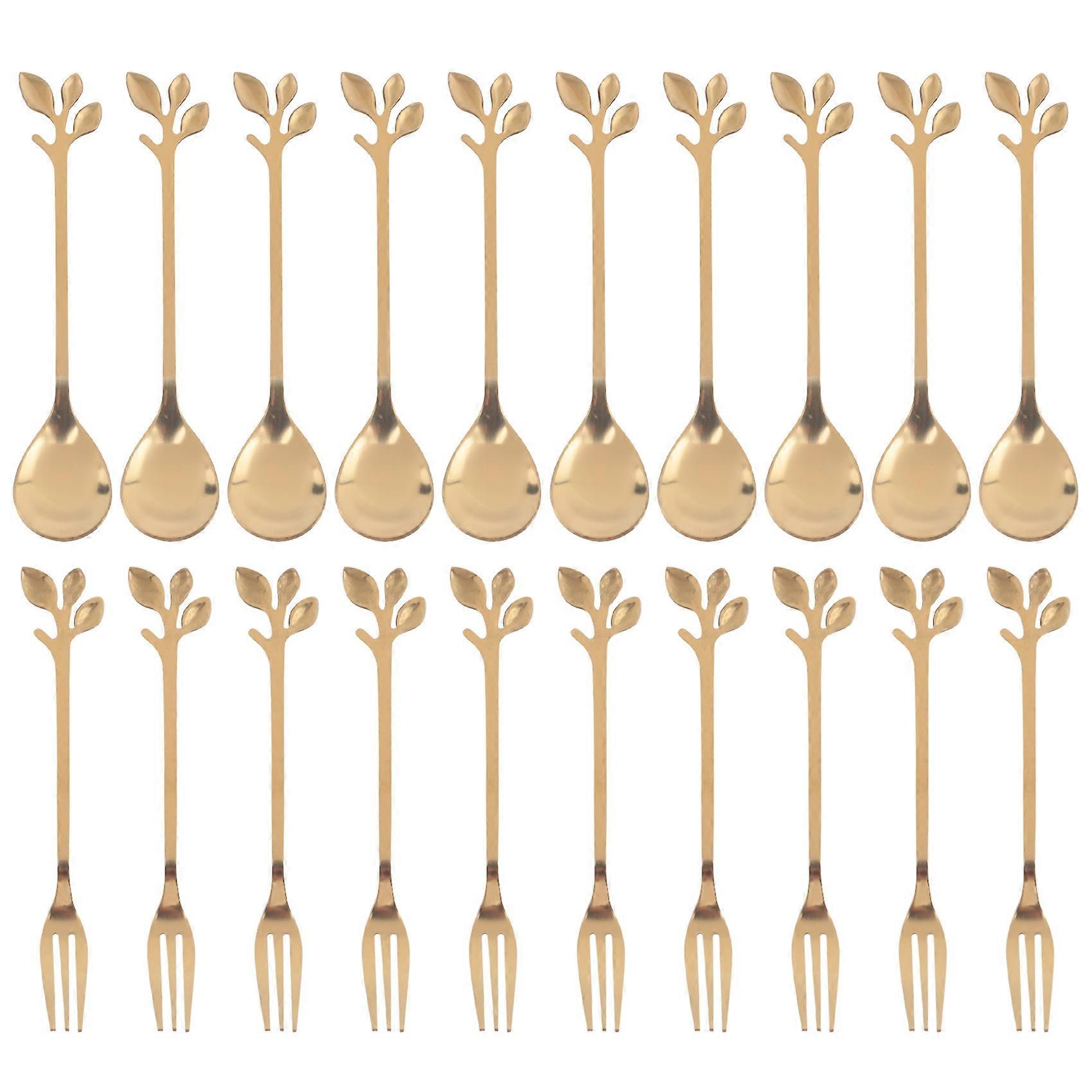 Dessert Spoon Fork Set,20 Pcs 4.7 Inch Cake Fork,Coffee Spoon,Creative Gold Leaf Fruit Fork,(10 Spoon + 10 Fork)