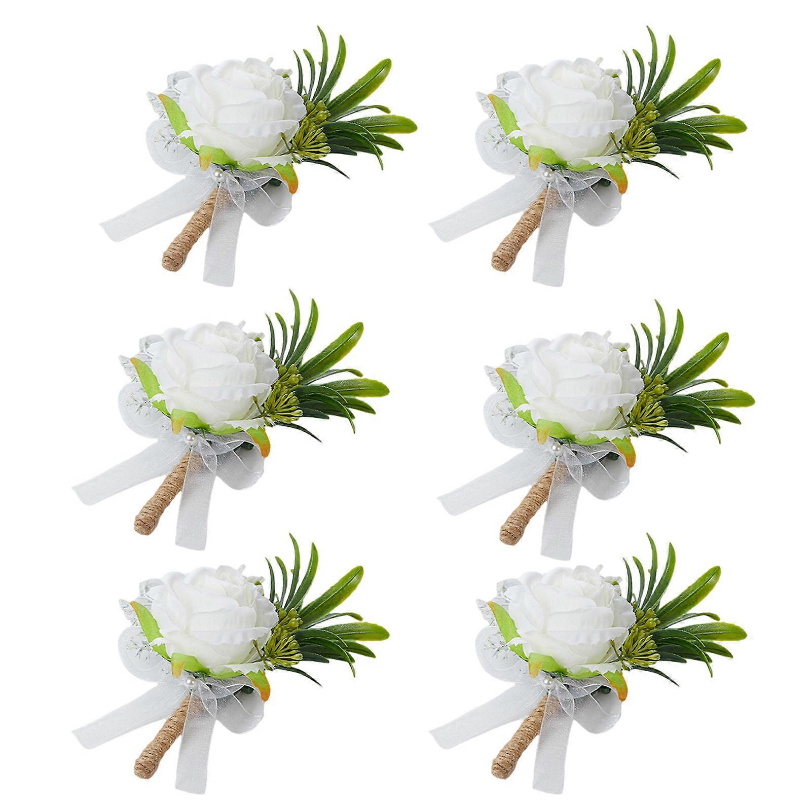 6Pcs Simulated White Rose Pin Artificial Flower Boutonniere Faux Florals Decorations Wedding Accessories for Bridals Multicolor