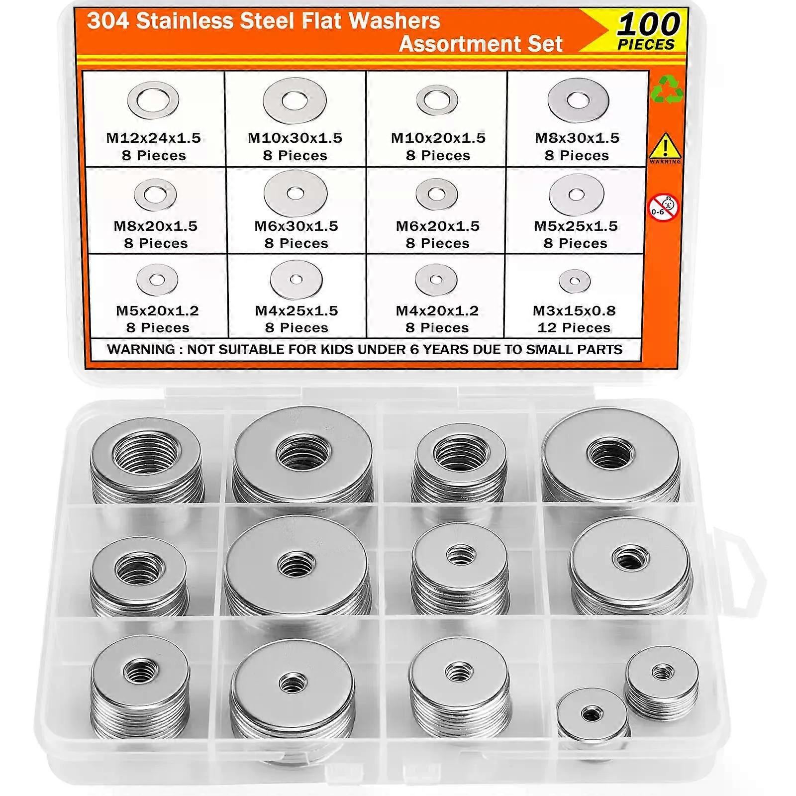 100Pcs 18-8(304) Stainless Steel Flat Washers Kit M3-M12 (12 Sizes), Assorted Hardware for Screws Bolts