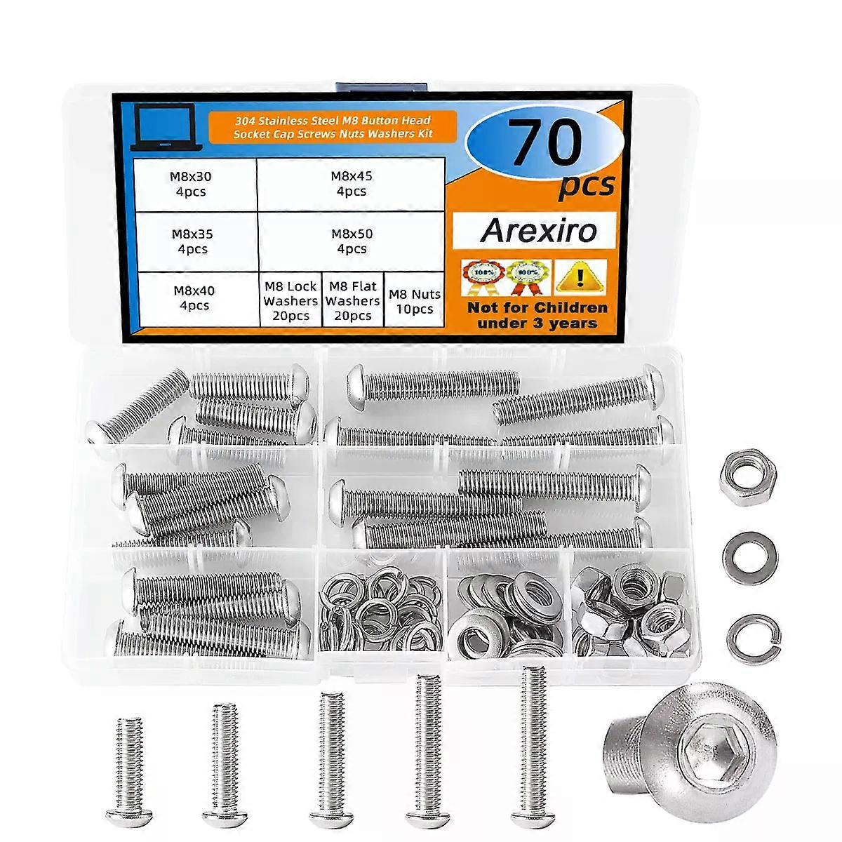 70Pcs M8x30/35/40/45/50mm Button Head Hexagon Screw Bolt Washer Nut Combination Kit 304 Stainless Steel