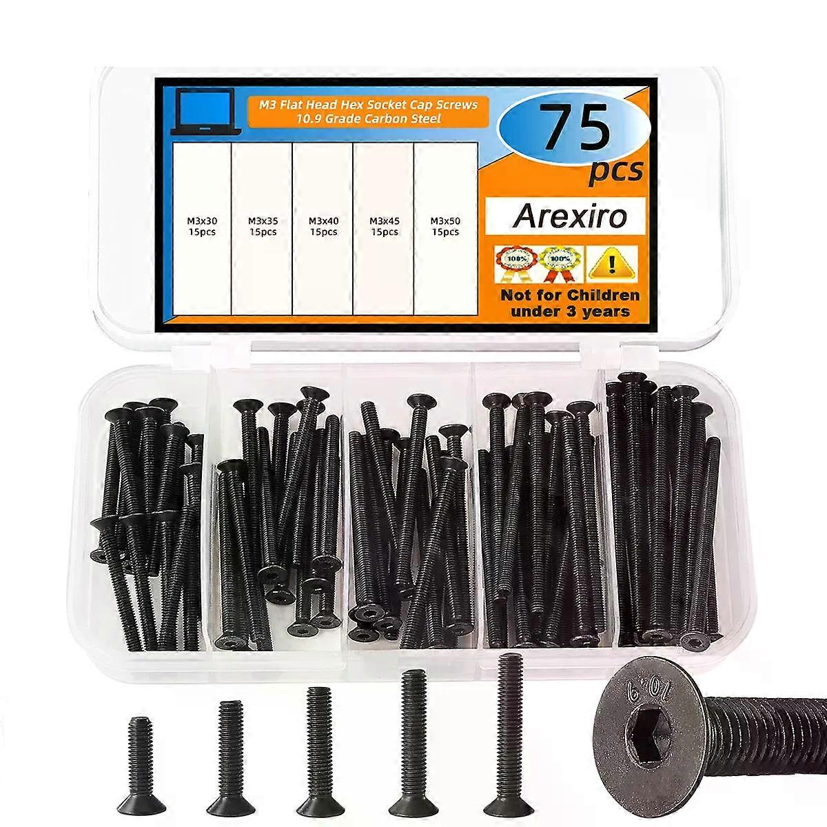 75Pcs M3x30/35/4045/50mm Flat Head Hex Screw Countersunk Bolt Grade 10.9 Carbon Steel