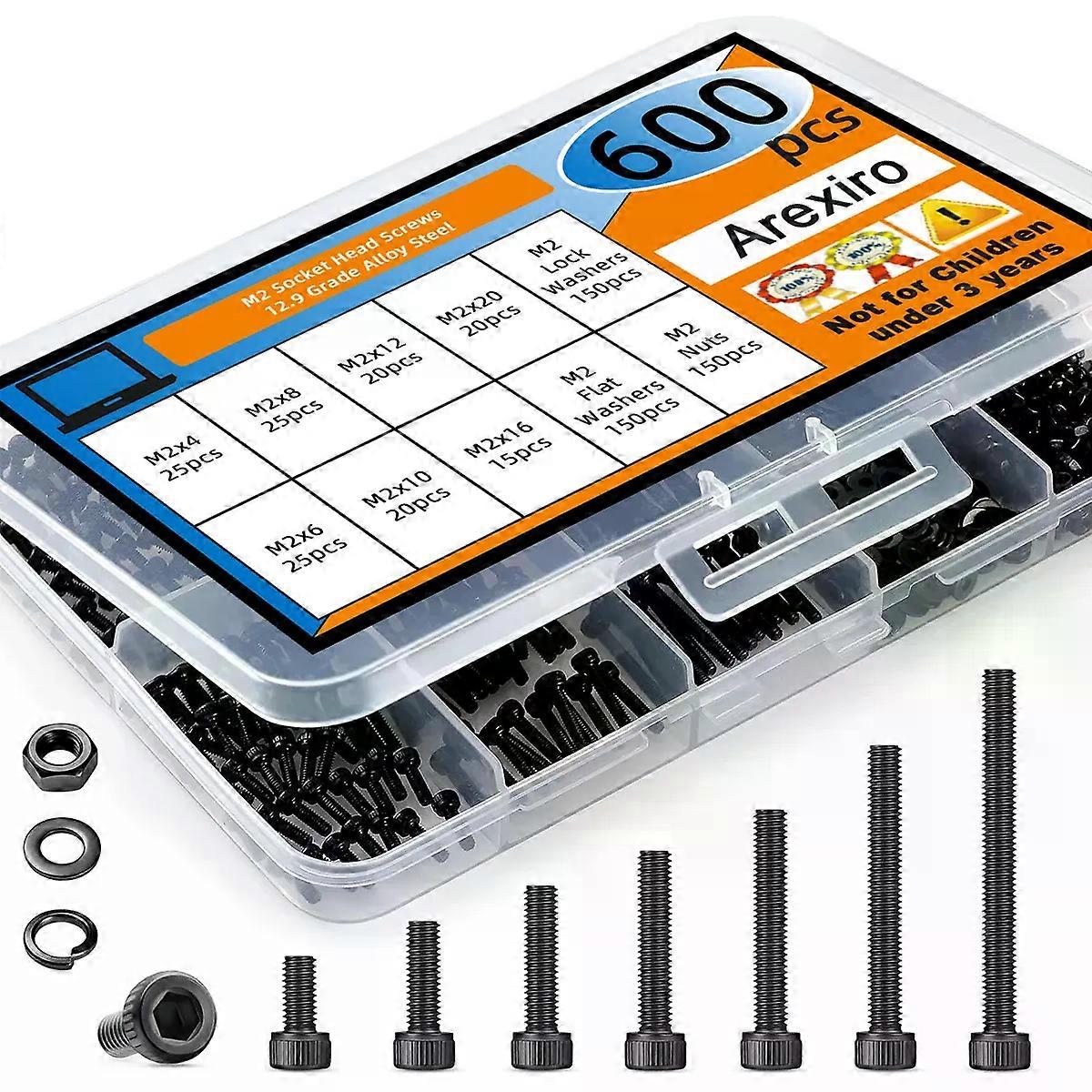600Pcs M2 12.9 Grade Alloy Steel Screw Kit Black M2 Screws in 7 Sizes Hexagonal Socket Head Cover Small Metric Bolt Nut