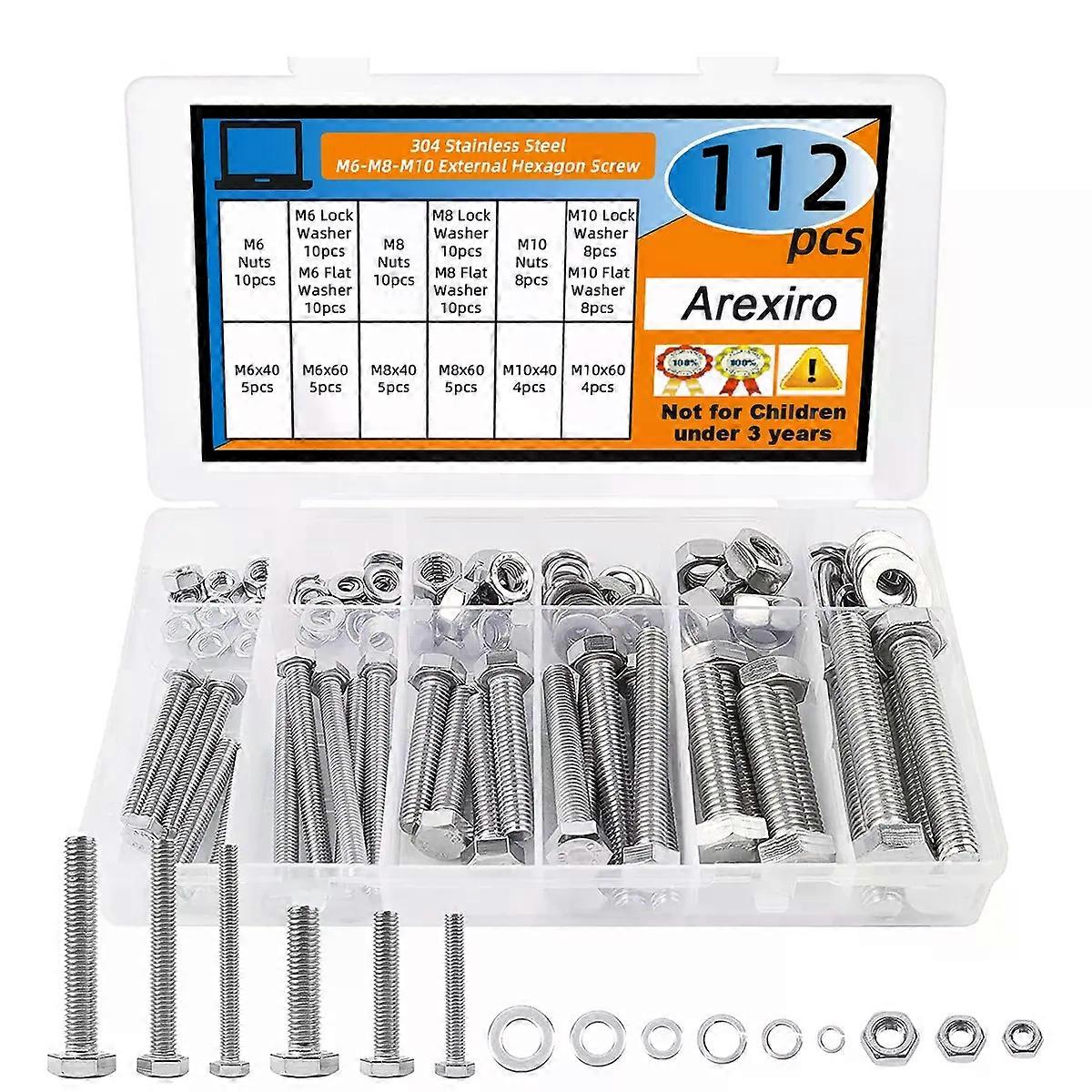 112Pcs Hexagon Screws M6 M8 M10 Stainless Steel Hexagonal Screw with Nuts Machine Screws Thread Screws and Washers
