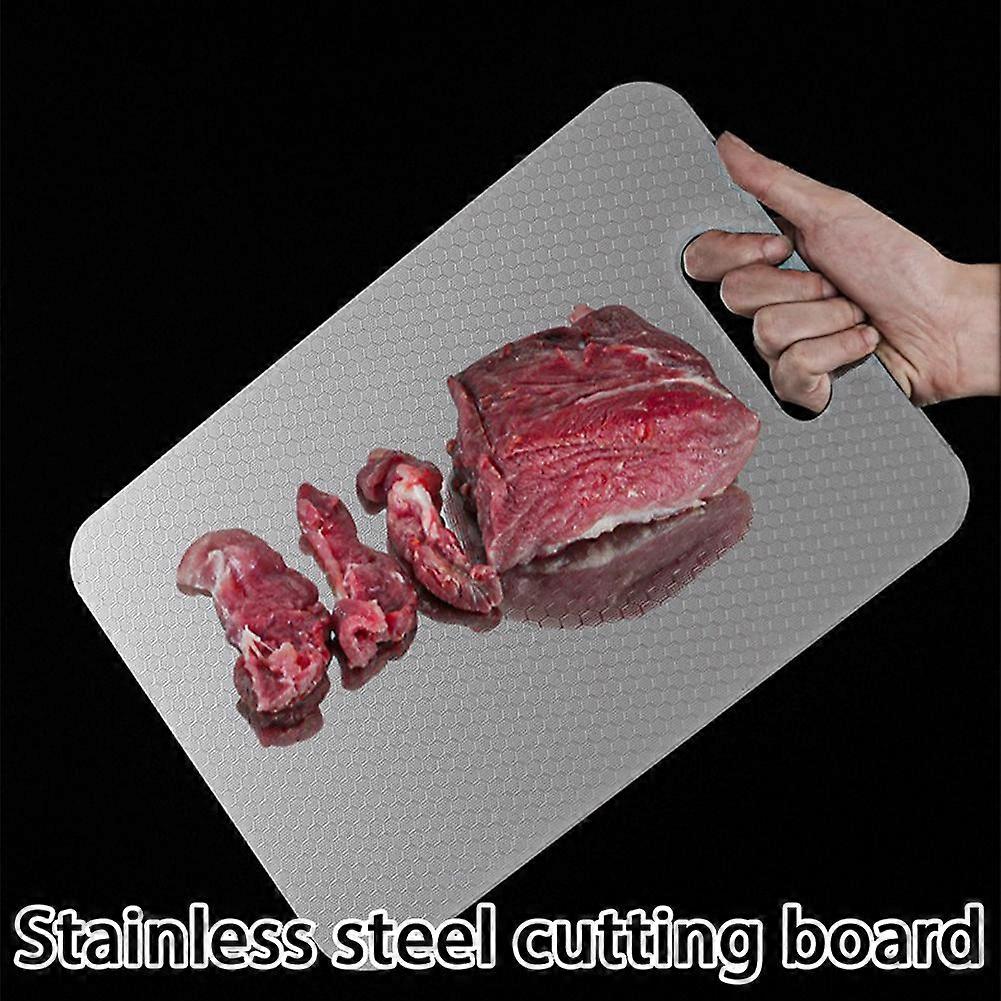 Stainless steel cutting boards are extremely resistant to scratches, dents and stains. They can withstand heavy-duty use and will not warp or deteriorate over time. SANITARY: Stainless steel is a non-porous material, which means it will not absorb , odors or tastes. This makes it the best choice for keeping cutting surfaces hygienic as it is easy to clean and sanitize. EASY TO CLEAN: Stainless steel cutting boards are dishwasher safe, making them easy to clean and maintain. They can also be wiped clean with a rag or sponge and the smooth prevents food particles from remaining. FRIENDLY: Stainless steel cutting boards are gentle on knives and help keep them sharp for a long time. The smooth stainless steel reduces friction for smoother and more precise cuts. Versatile: Stainless steel cutting boards can be used for a variety of food preparation tasks, including slicing, dicing and chopping. Stainless steel cutting boards are also heat-resistant, making them suitable for use as cutting boards or for transferring hot pans from the stovetop to the countertop. Product Name: Stainless Steel Cutting Boards Stainless Steel Cutting Boards Material: stainless steel Size: 34x23cm/13.38*9.05in,30*20cm/11.81*7.871inch,15*24cm/5.99.441inch, Package: Stainless steel cutting board * 1 pc