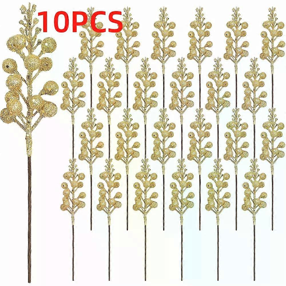 10Pcs Ornaments Glitter Artificial Flowers DIY Garland Branches Xmas Tree Ornaments Gold Powder Berry Bouquet New Year