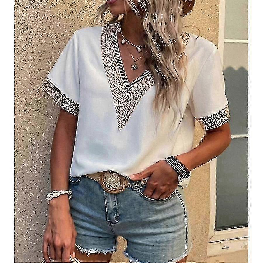 w Women's Summer Tops Fashion Clothes Casual V-neck Chiffon Blouses Short Sleeve Tee Shirts Ladies Solld Color Loose Lace Shirts