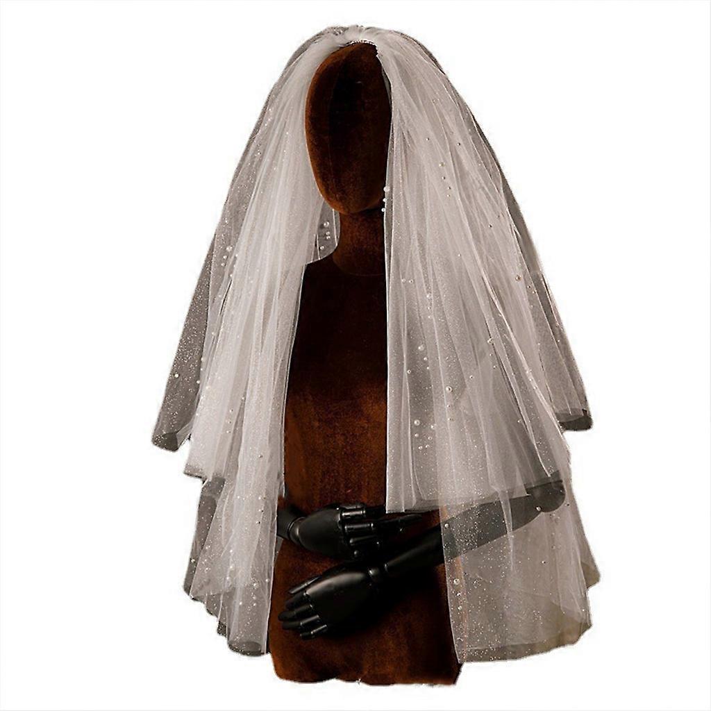 Bridal Veil with Comb Double-Layer Cut Edge Pearls Decoration Illusion Tulle Short Glitter Veil for Bride and Bridesmaid Multicolor