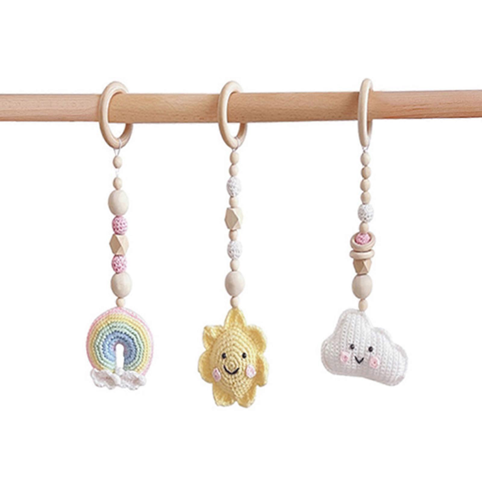 3 Pcs/Set Baby Gym Frame Pendants Crochet for Sun Cloud Rainbow Rattles Wooden Ring Teether Toys Infant Newborn Teething Multicolor