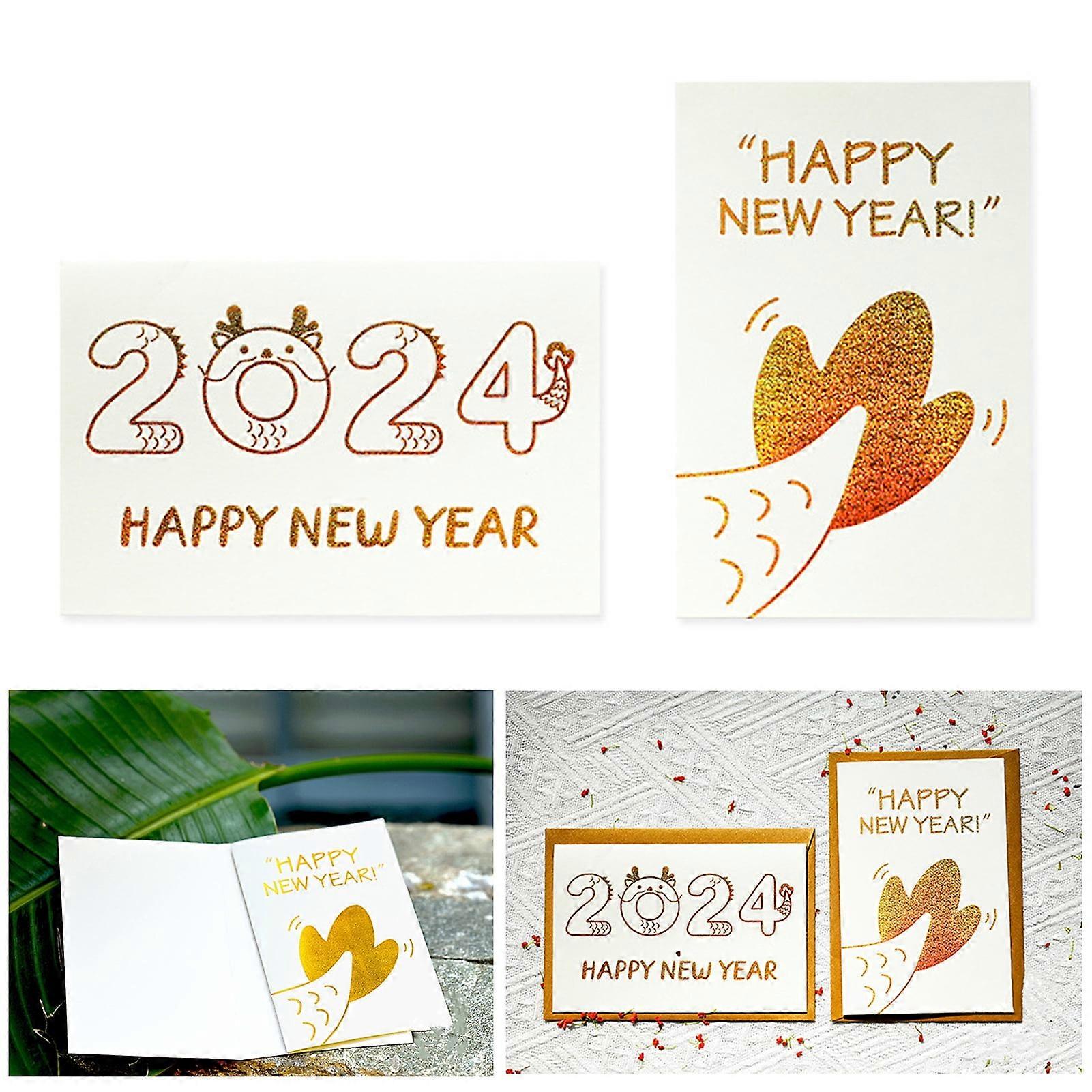 SUSUchens 10Pcs Happy New Year Greeting Card with Envelope, Cartoon Foldable Golden Letter, Chinese 2024 Year of The Dragon Blessing Card Kit Style A