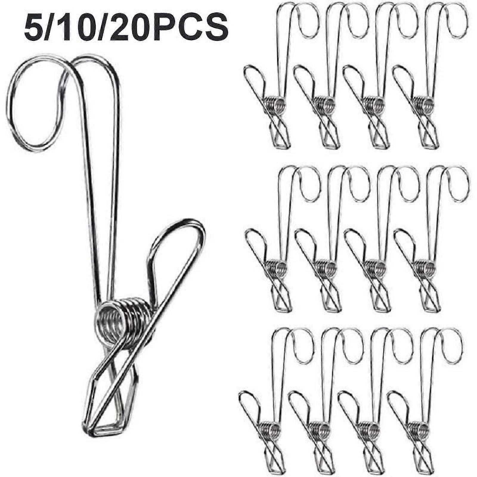 Stainless Steel Metal Long Tail Clip with Hooks Clothes Pins Hanging Universal Clips for Kitchen Bathroom Office,5 Pack