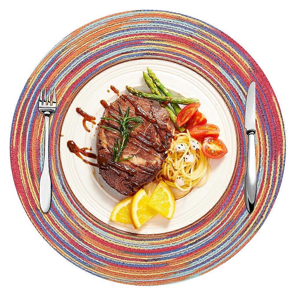 Specification: Color: Rainbow Material: Woven Occasion: Wedding, Graduation, Christmas, Housewarming Shape: Round Number of Pieces: 6 Item Weight: ‎11.2 ounces Product Dimensions: ‎15"D x 15"W x 3.5"H About this item:: 100% Polyester Imported 6 HIGH-QUALITY PLACE MATS - Your purchase includes 6 pcs round top quality woven braided placemats. They look elegant and can be used at home or in patio. Try it RISK-FREE now with our Money Back Guarantee. PROTECTS YOUR TABLE - These Place Mats protects your tabletop from hot plate marks, scratches and spill stain from food or drinking glasses. They are round and 15-inch total, large enough for any plate or bowl. ELEGANT DESIGNED - Our Place Mats are colorful and fit almost any kitchen or dining room decoration. Great for everyday use inside or outside. They are super easy to store, simply roll them and place them where you want too. THE PERFECT GIFT - These Place Mats is a great gift for your mom, dad, sibling, cousin or friend. Perfect for birthdays, Christmas, housewarming, graduation and much more.
