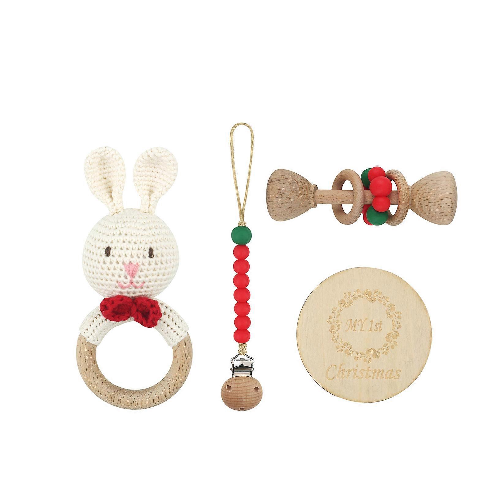 4-Pack Wood Baby Toy Fine Motor Development Sensory Skills Toy Pacifier Clip Grasping Toy Wood Ring Rattle Bell Multicolor