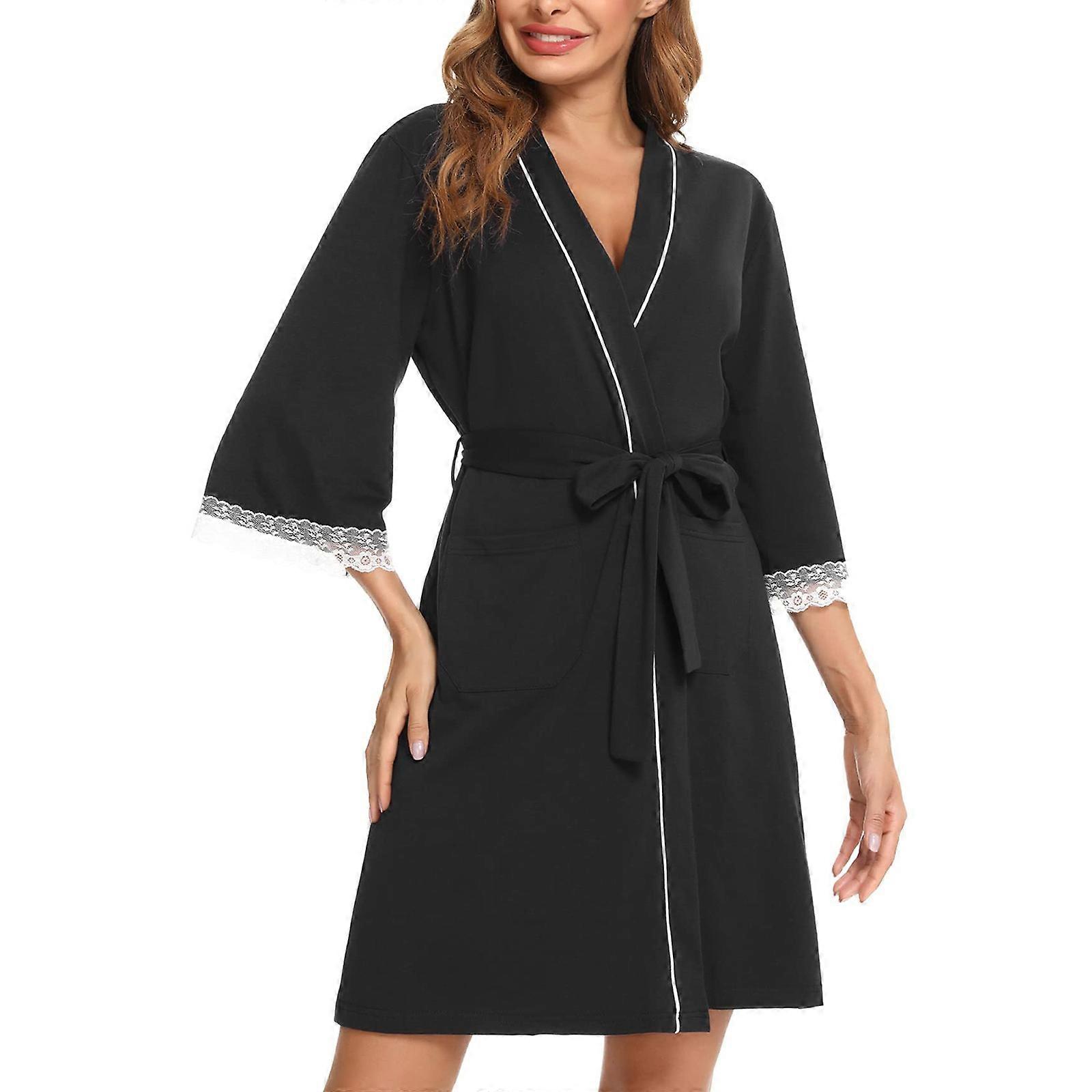 Womens Imitation Cotton Robes Lightweight Bathrobe with 3/4 Sleeves Belted Pockets Soft Sleepwear Ladies Loungewear XL Black