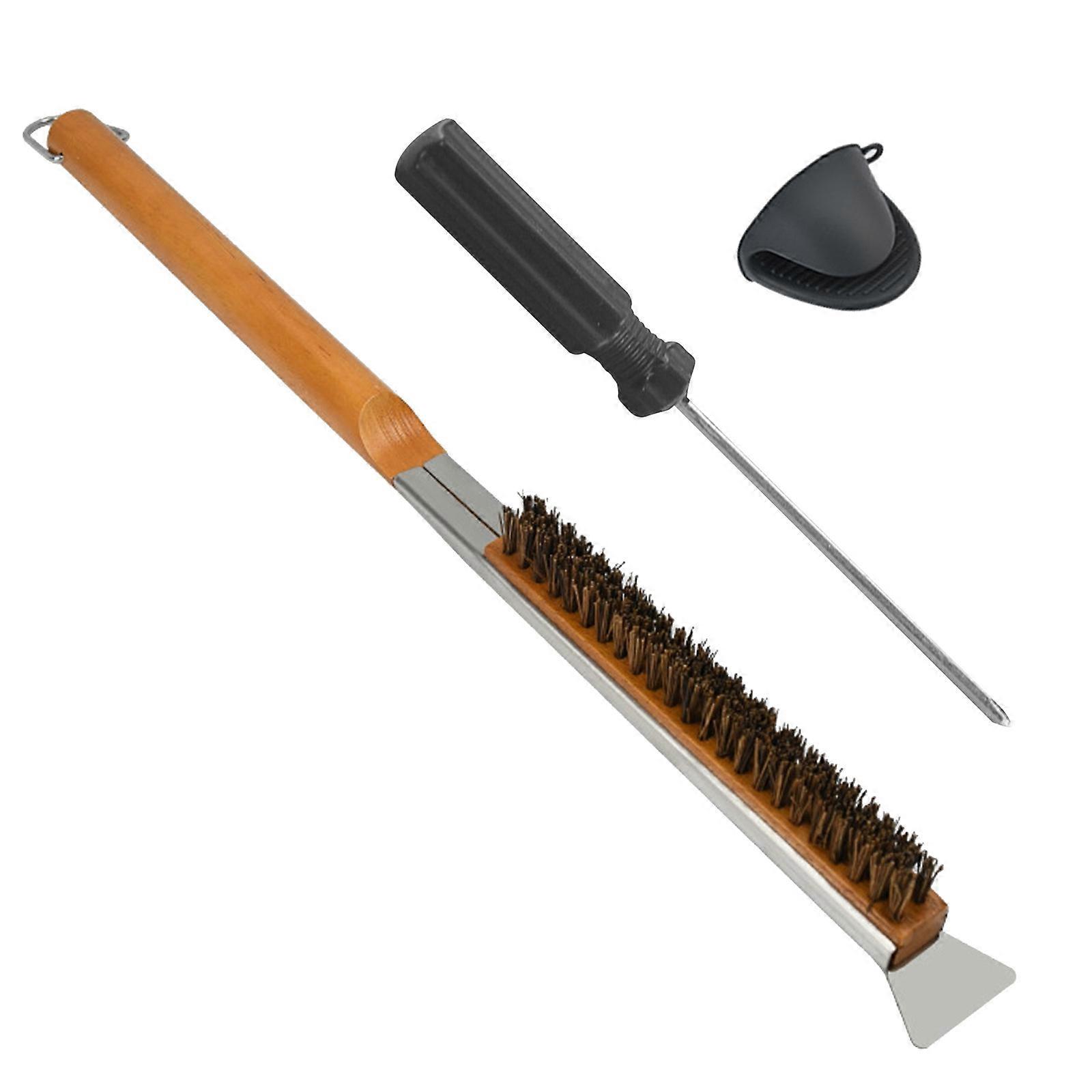 Pizza Oven Brush, Copper Wire Pizza Stone Cleaning Brush with Scraper, Barbecue Grill Cleaning Tool with Wood Handle Multicolor