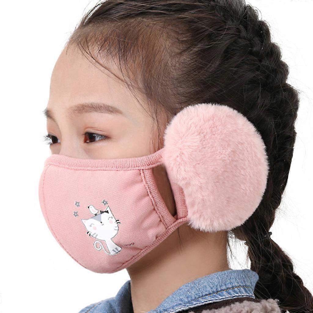 Children Kids Winter Windproof Cotton Mouth Mask with Plush Earmuffs Cartoon Animal Print Student Dustproof Washable Face Cover Ear Warmers 5-10