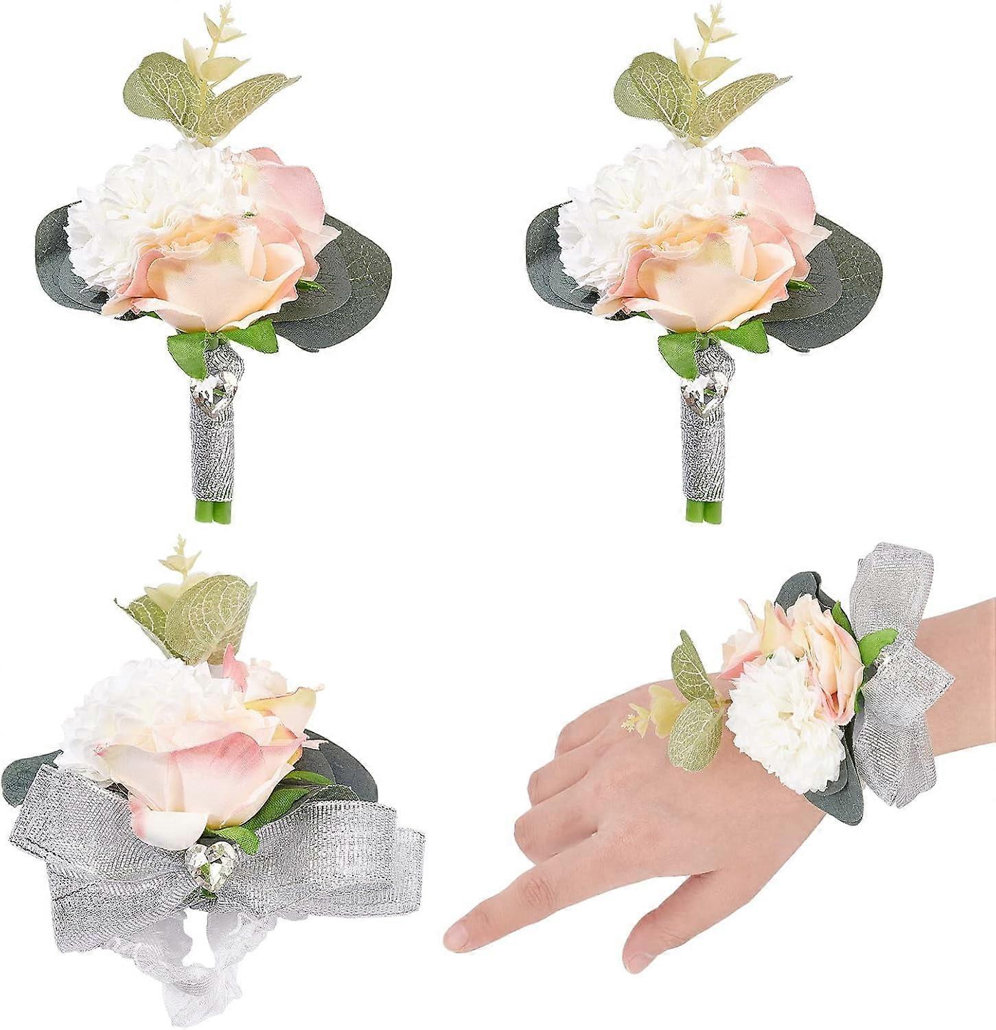 4pcs 2 Styles Flower Wrist & Boutonniere Set, Artificial Peony Rose Corsage with Silk Ribbon, Bride & Groom Wedding Party Prom DIY
