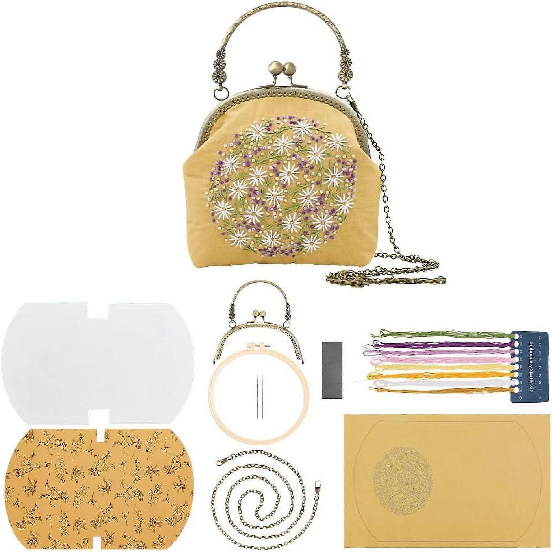 DIY Embroidery Coin Purse Kit Yellow, Flower Pattern Sewing Material with Kiss Clasp, All Supplies Included 8.2x6.4x1.5 inch