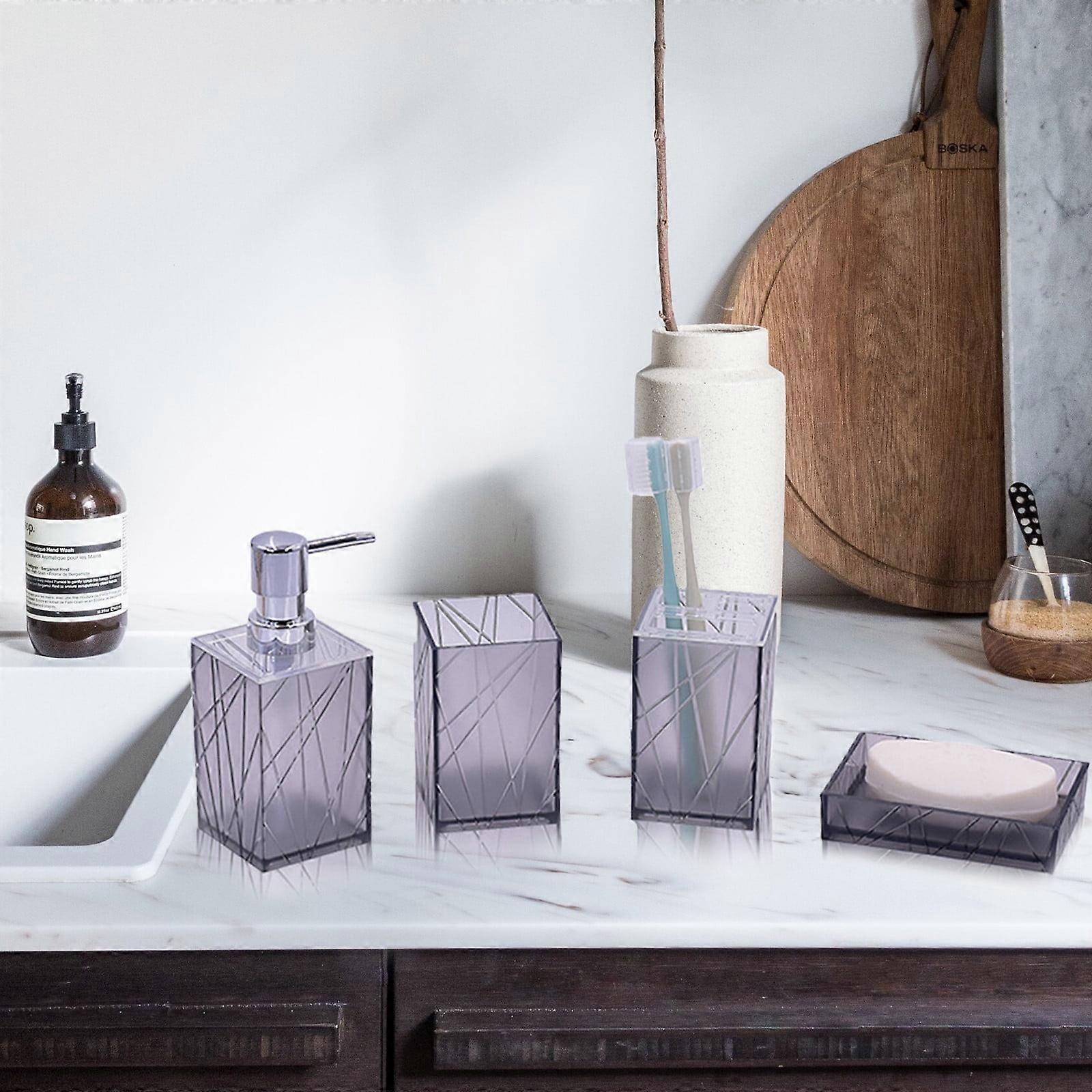 Quinlirra Bathroom Accessory Set of 4: Soap Dispenser, Toothbrush Holder, Tumbler, Soap Dish - Gray. Compatible with modern bath decor.