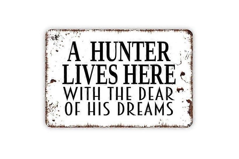(Aluminum metal) A Hunter Lives Here With The Dear Of His Dreams Sign Cute Wedding Anniversary Metal Wall Art Size: 16 x 12 Inch