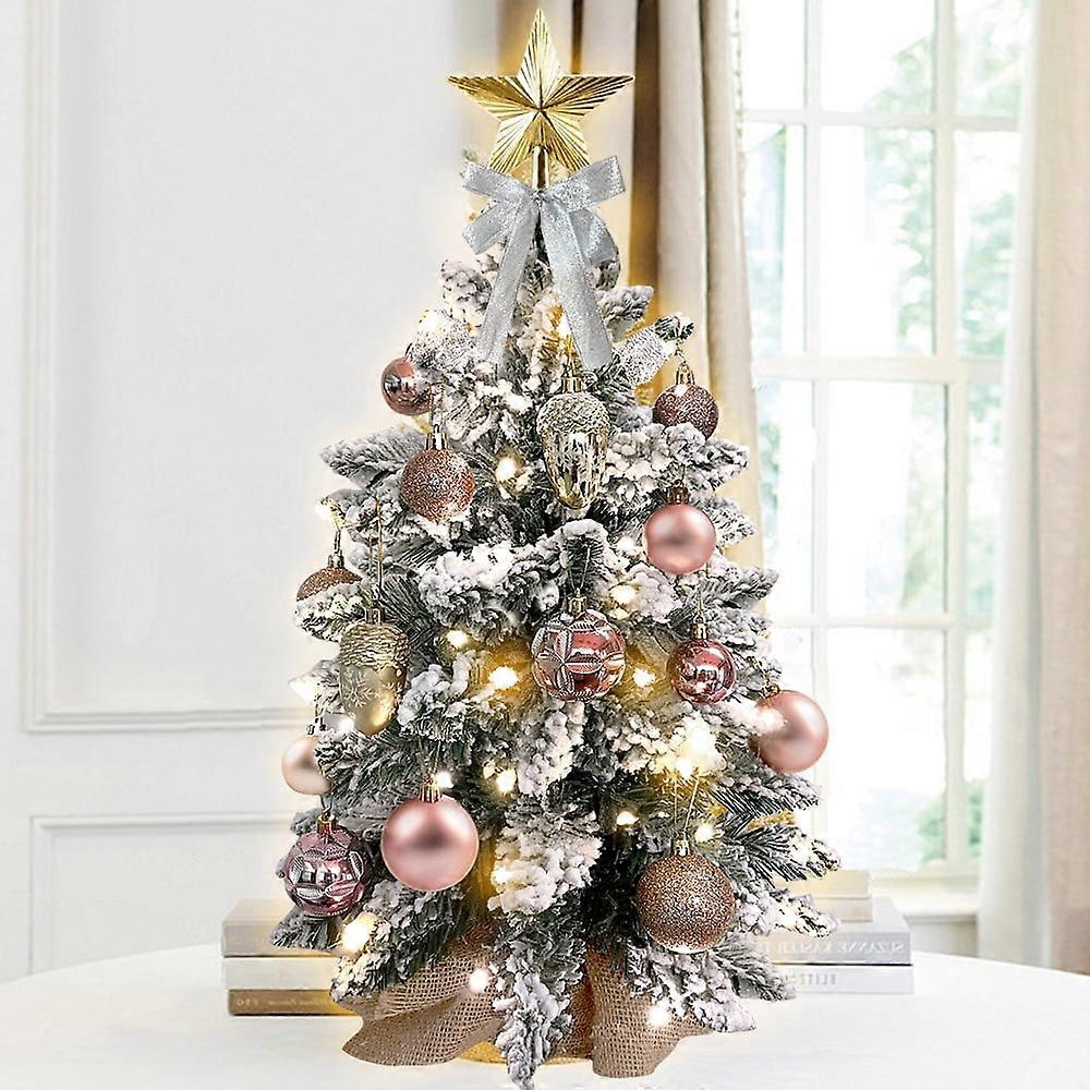 22in Mini Christmas Tree with Lights, Rose Gold Flocked Snow, Compatible with Table Top Decor, for Home & Office