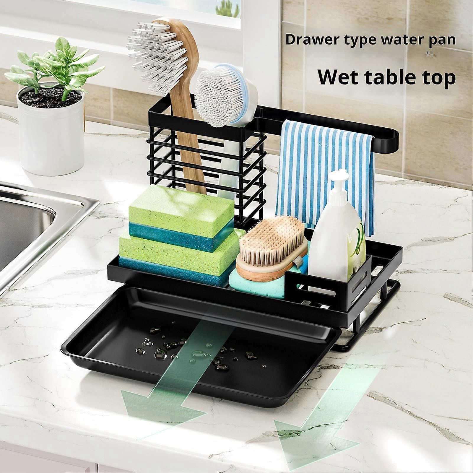 SUSUchens Sink Caddy Kitchen Organizer Sponge Holder with Drain Tray Rustproof Corrosion Resistant Dish Brush Scrubber Sink Brush Holder Black