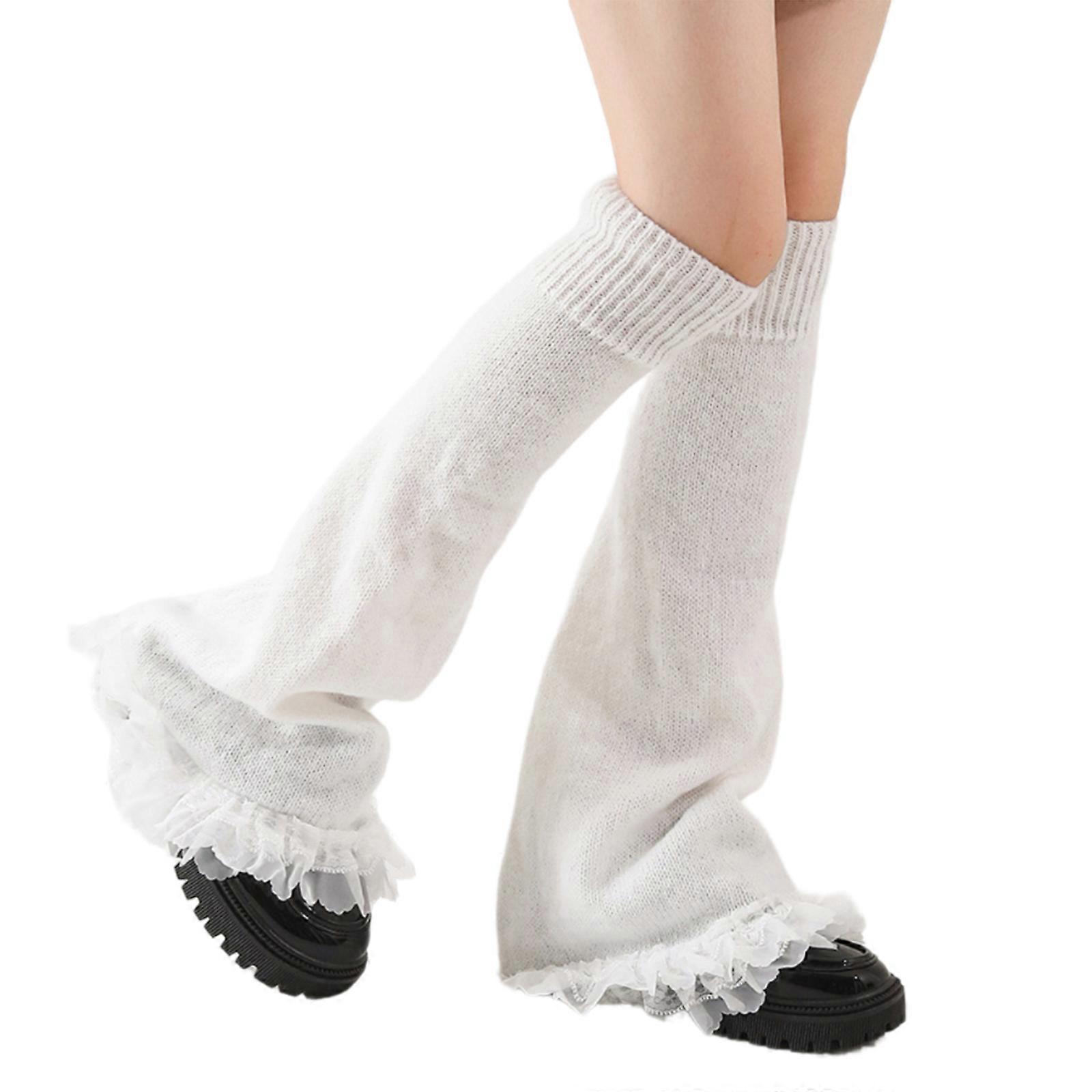 Aesthetic Elegant Ruffled Lace Trim Leg Warmer Women Japanese Harajuku Knit Striped Leg Sleeve Cover Knee Length Socks White