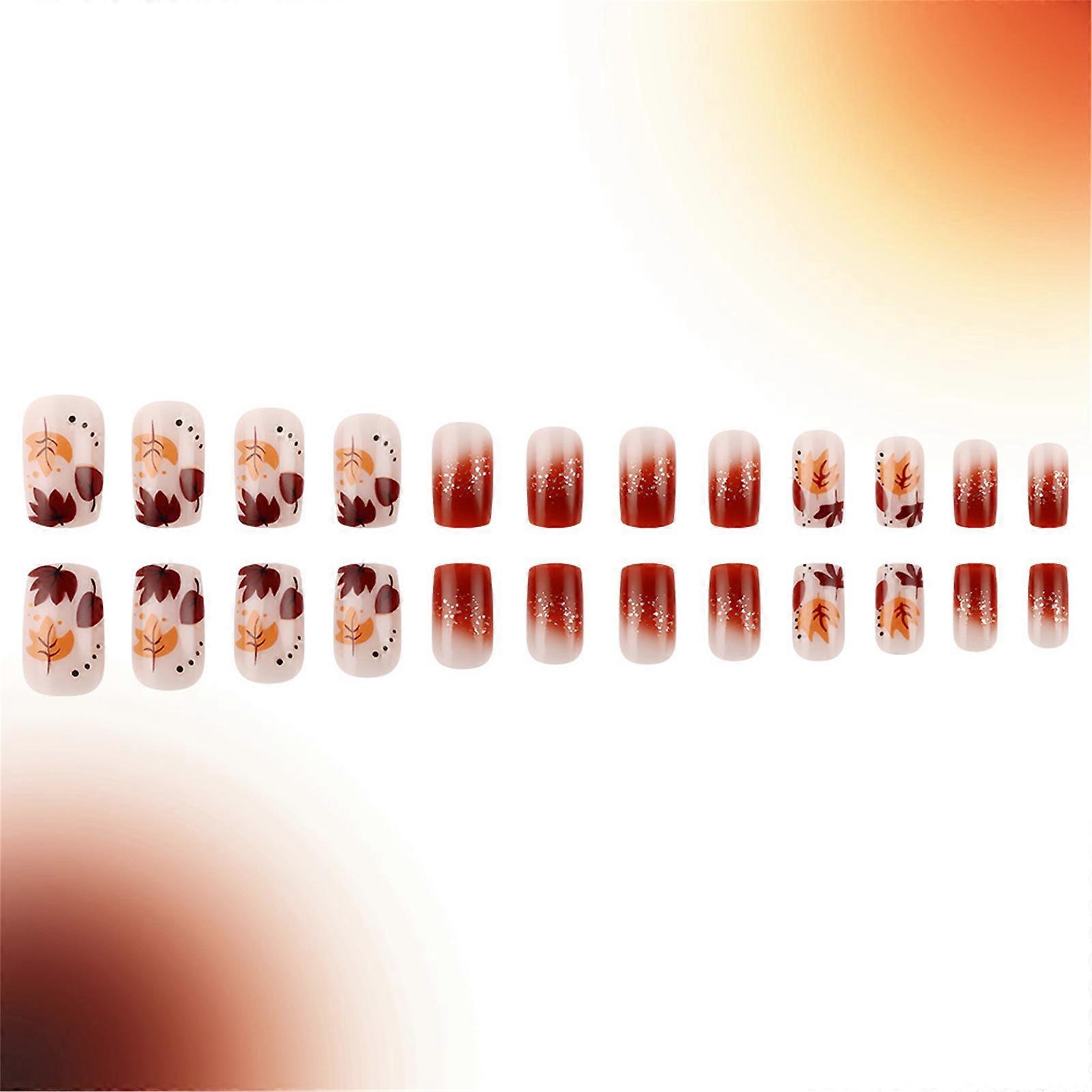 Autumn Manicure Set 24 Pcs Short Square Press on Nail with Orange Glittering and Maple Leaf Designs Nail Art Ornament Multicolor