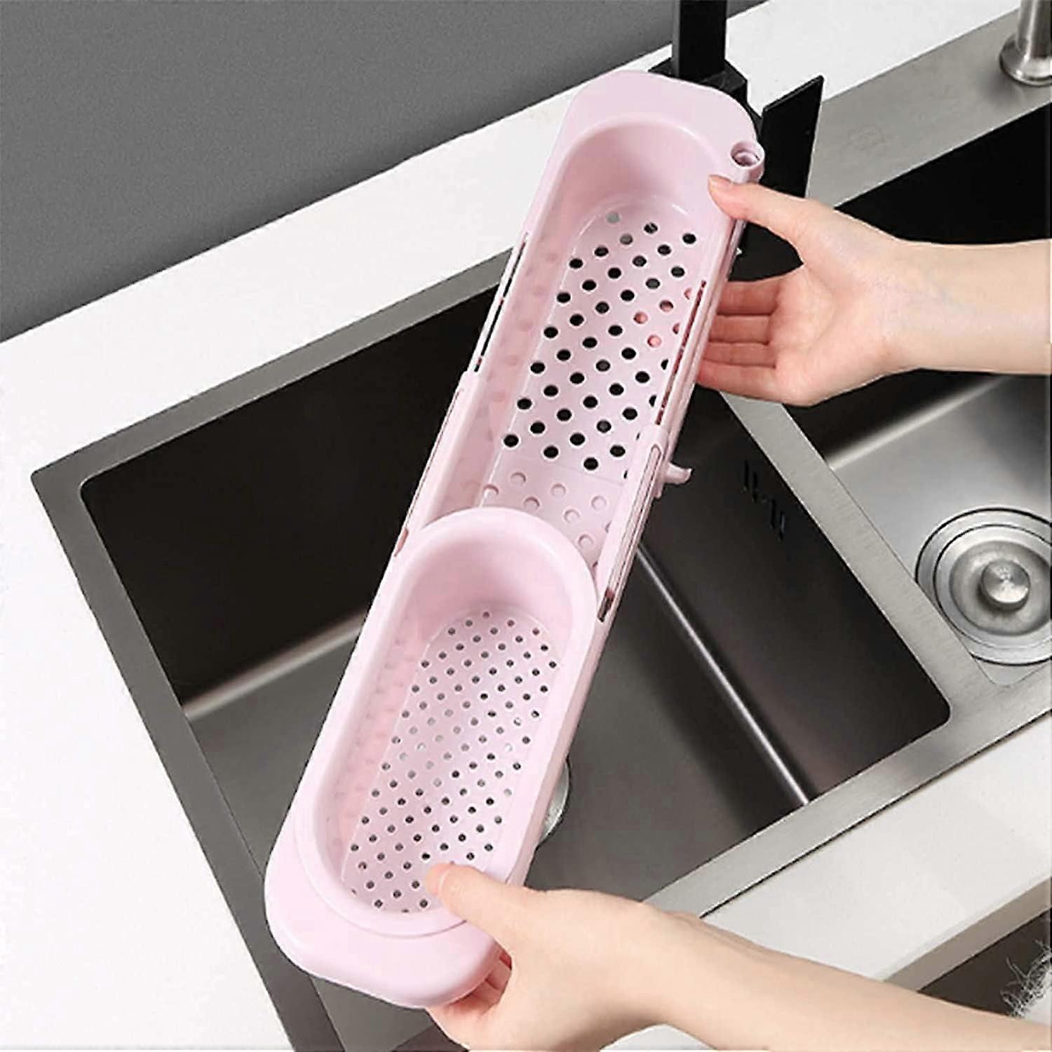 Expandable Sink Storage Rack with Drain Basket, Compatible with Kitchen Sink Organizer for Soap & Sponge – Pink