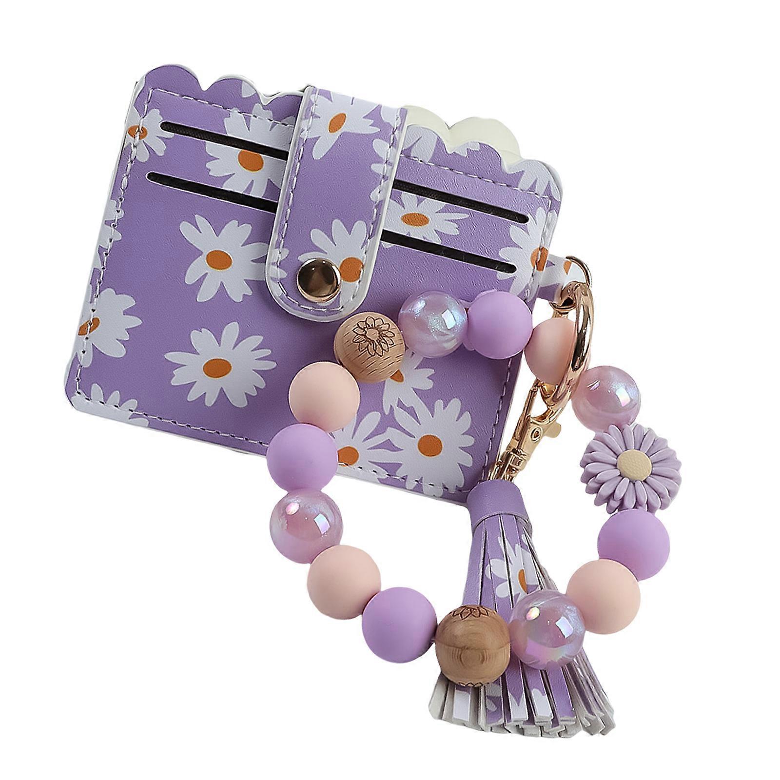 Charming Floral Beaded Keychain With Bracelet PU Leather Women Girls Jewelry Gift Purple