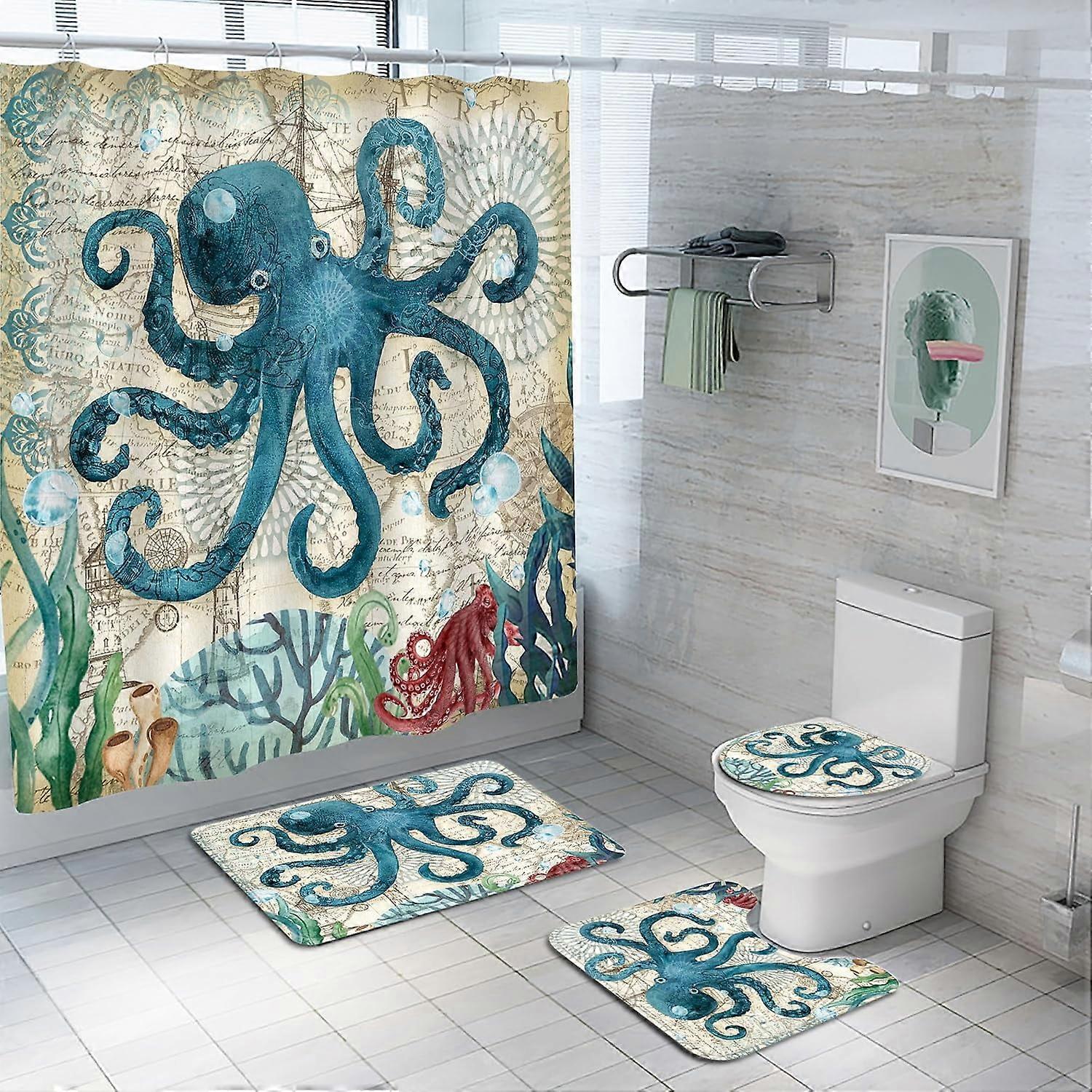 4Pcs Octopus Waterproof Shower Curtain Set, Ocean Bathroom Sets with Curtain, Toilet Lid Cover, Rug, Contour & Bath Mat, 12 Hooks