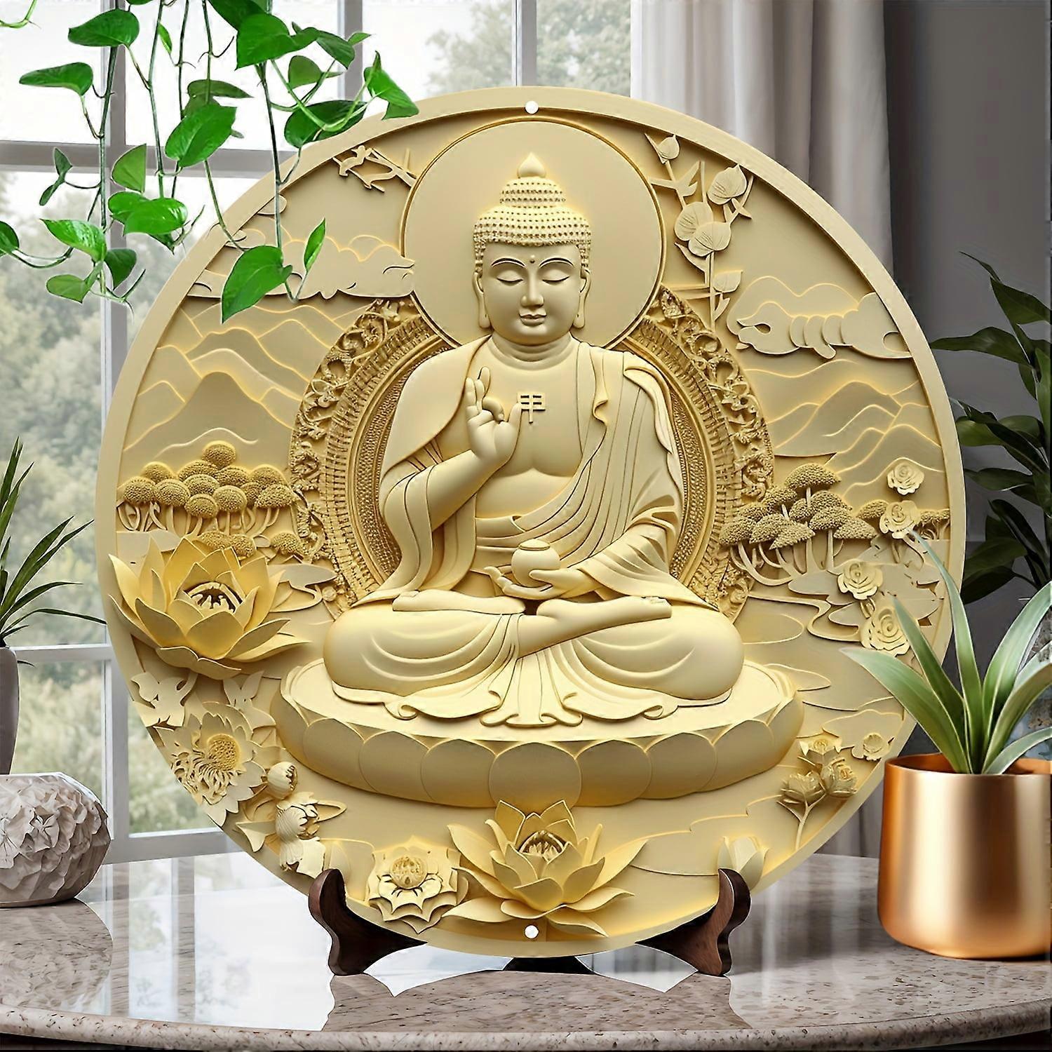 1pc Aluminum Tathagata Buddha Wall Art Plaque, Circular Metal Wreath Center Logo, Waterproof Welcome Sign for Home, Garage, Bathroom - 8x8"