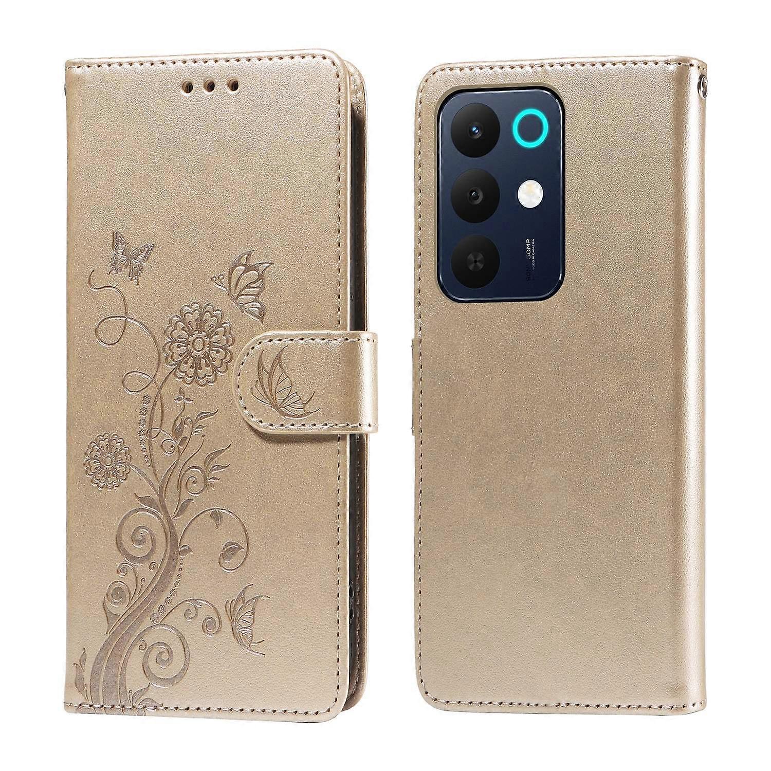 For Realme C85 5G Leather Case Butterfly Floral Imprint Wallet Stand Cover - Golden
