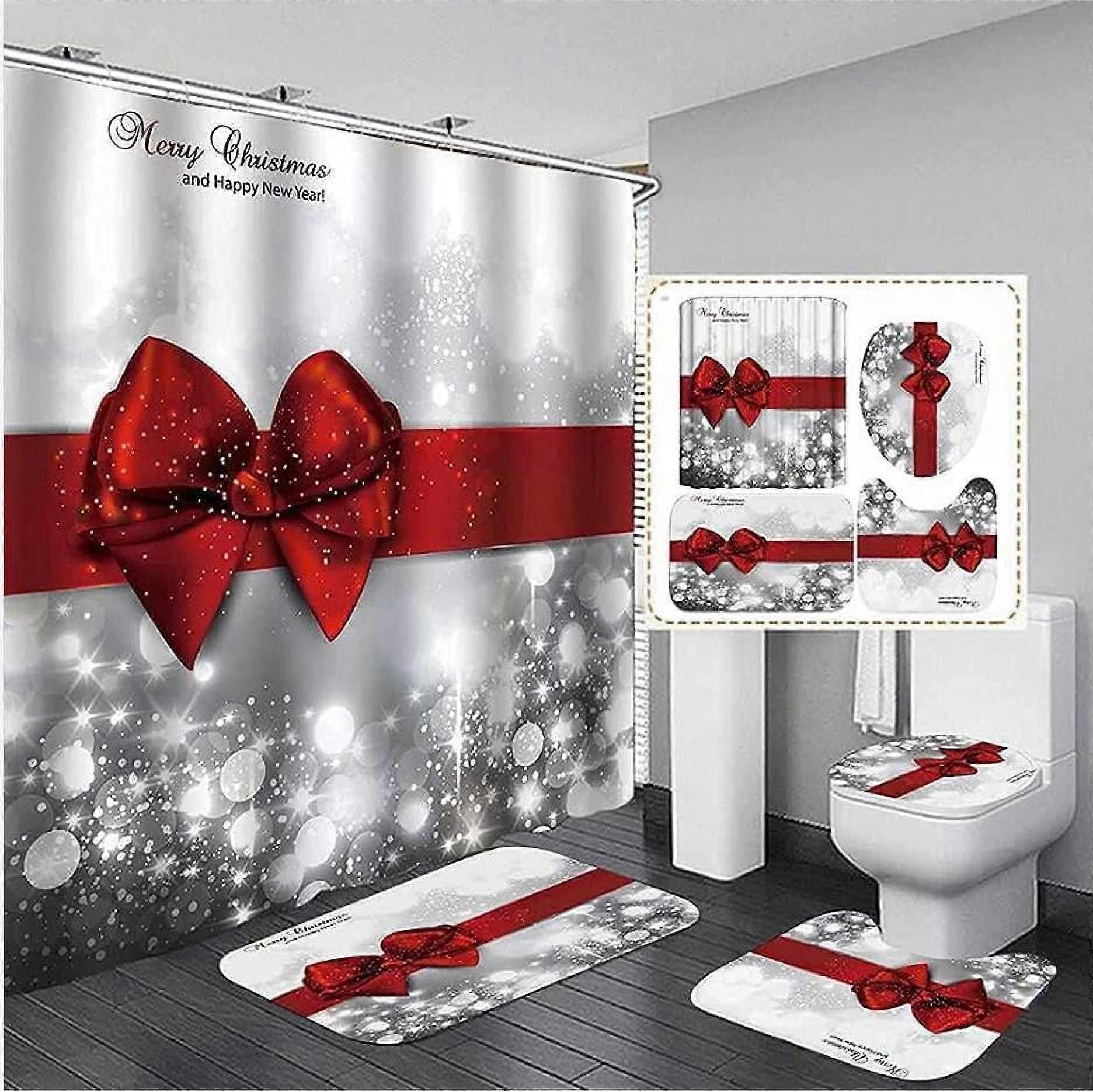 4-Pc Christmas Shower Curtain Set with Non-Slip Rug, Toilet Cover & Bath Mat, 12 Hooks, Waterproof - Compatible with Standard Showers