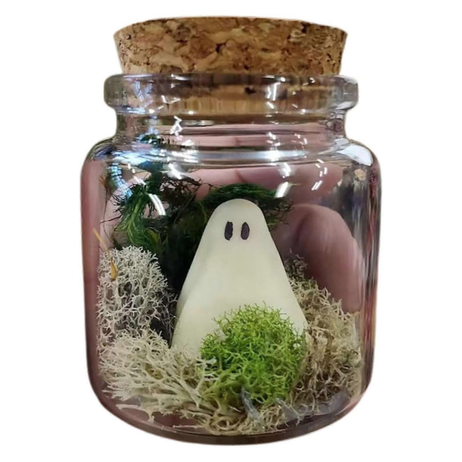 SUSHANG Mini Pet Ghosts in a Jar, Luminous Ghost Figurines with Moss in Glass Dome, Glow-in-the-Dark Halloween Decor
