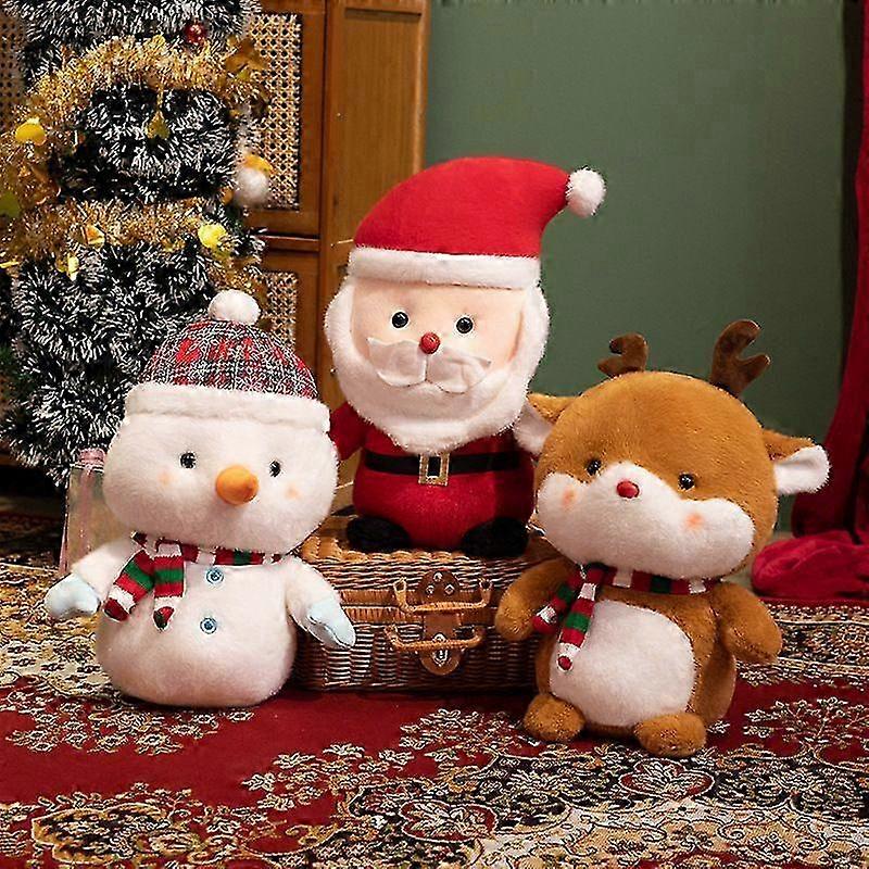 A. This Christmas plush ornament set features three classic holiday characters: jolly Santa Claus, charming snowman and lovely reindeer. B. Crafted from short plush fabric with soft texture and generous stuffing that maintains shape well. Each doll is meticulously handmade with attention to details and expressive facial features. C. Equipped with discreet hanging loops for easy display on Christmas trees, doors, windows or walls. 38cm large size suitable as statement decorations, 25cm standard size ideal for combination displays. D. These Christmas dolls serve not only as beautiful festive decorations but also as carriers of warmth and blessings. They add a strong holiday atmosphere to your home space and create a warm romantic Christmas ambiance. The beautiful packaging makes them suitable Christmas gifts for children, friends and family members.