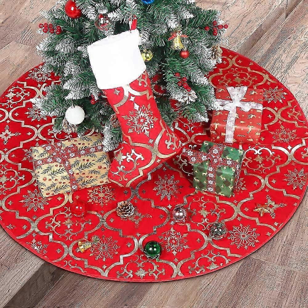 A. Christmas Tree Cover: Christmas tree skirt with snowflake pattern, rustic and traditional. It can give a home a Christmas atmosphere. B. Dimensions: Color: Red; 120cm in diameter; It can be used for various artificial and Christmas trees and covers the entire circumference of the tree. C. Easy To Use: The Christmas tree skirt with durable rope can be easily sewn onto the edge of this skirt of tree. And ornaments can be put on the tree skirt with the beautiful golden snow pattern. D. Multifunctional Christmas Tree Mat: It can protect the floor from scratches of the Christmas tree stand, which is suitable for Christmas party decoration. It is suitable for a variety of different themes: Christmas, Snow Dream, Winter and many more. E. Christmas Stocking Promotional Gift: There is no need to buy Christmas stockings separately. A well-matched Christmas stocking will be sent. It is a good gift for families as the Christmas holidays approach!