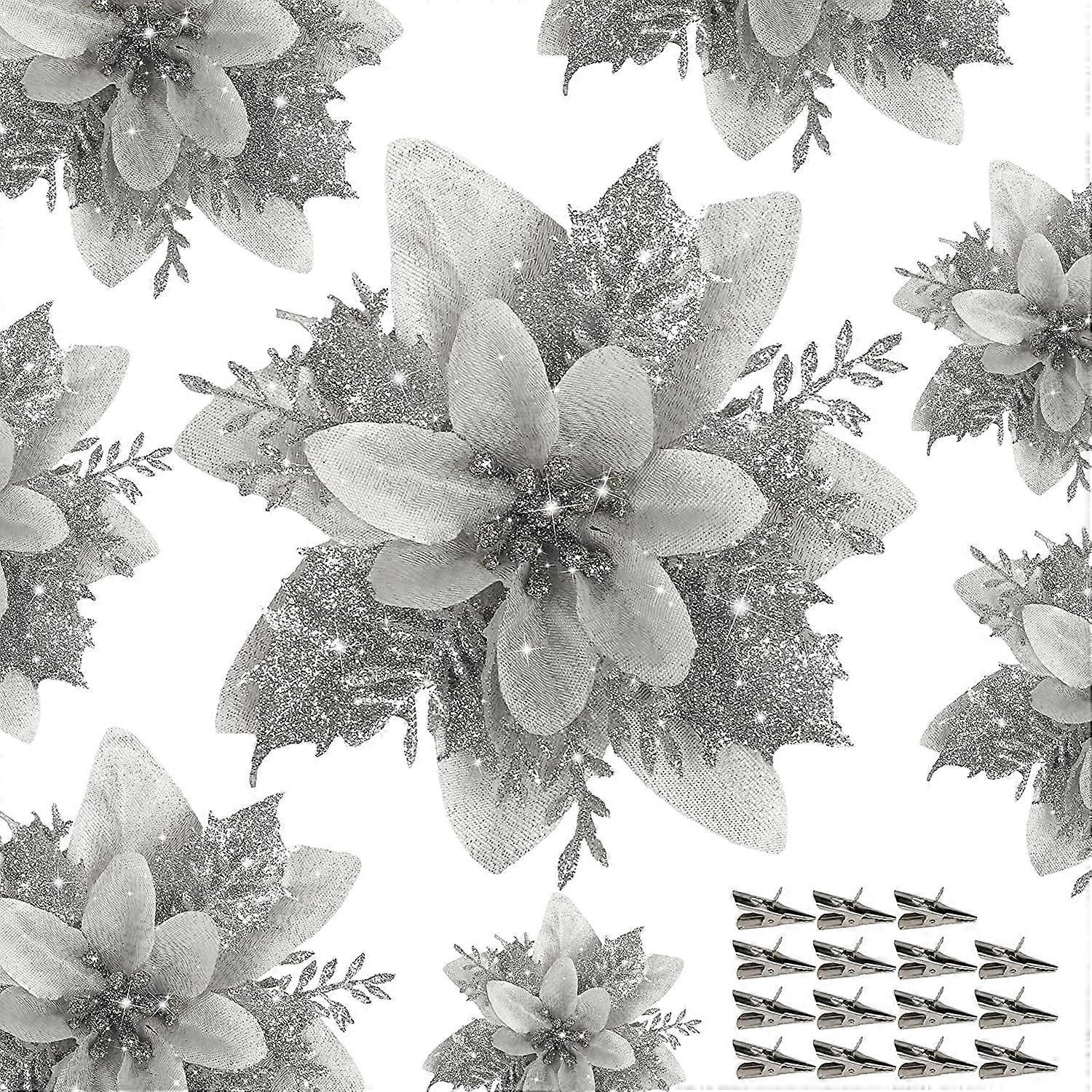 15PCS Artificial Poinsettia with Clips, Glitter Christmas Ornaments, DIY Xmas Tree/Wreath Decor, Holiday Home Party Flowers