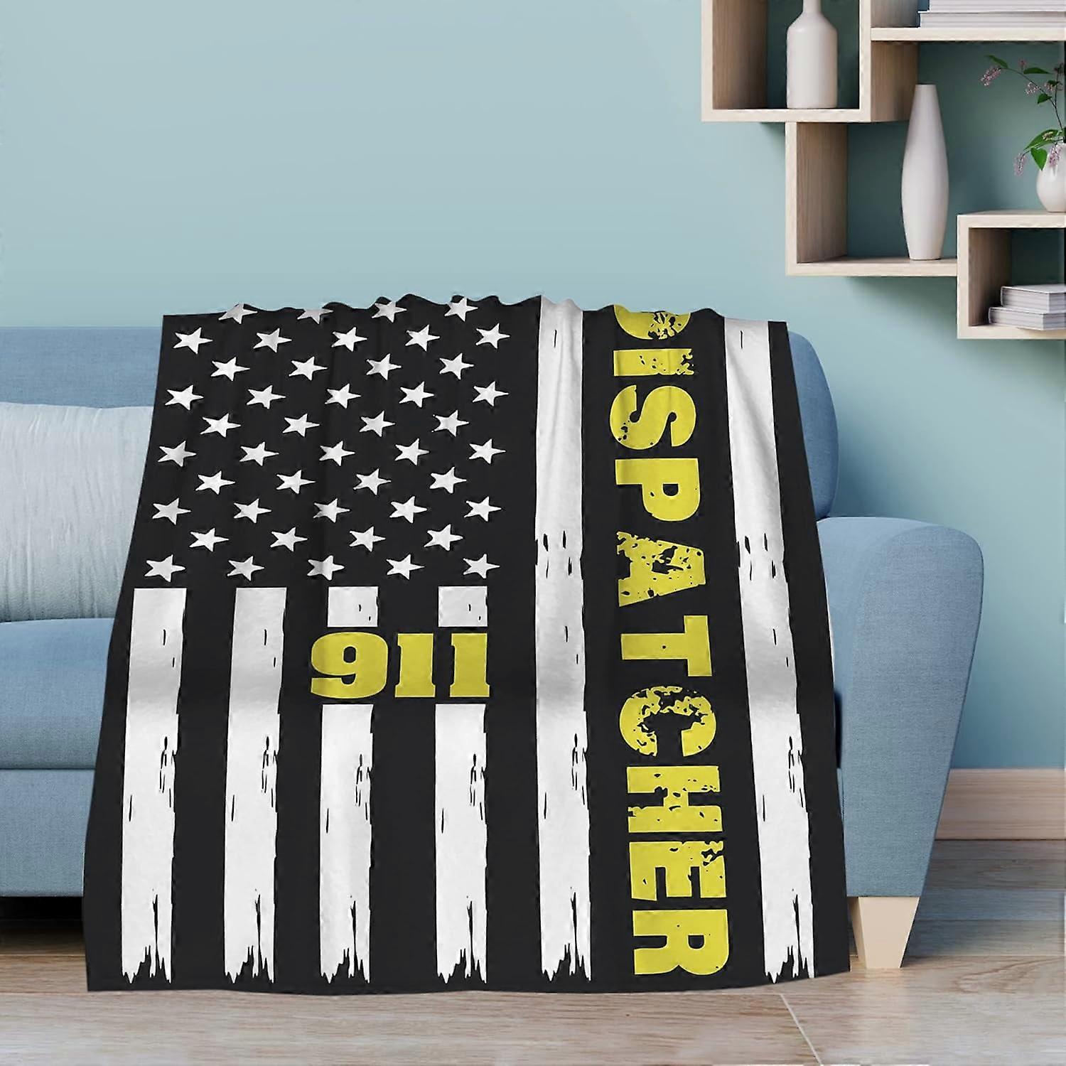 911 Dispatcher American Flag Blanket, Retro Gold Line USA Flag Throw for Men Women, Soft Black White Fleece Cozy Flannel Sofa Bed Blanket