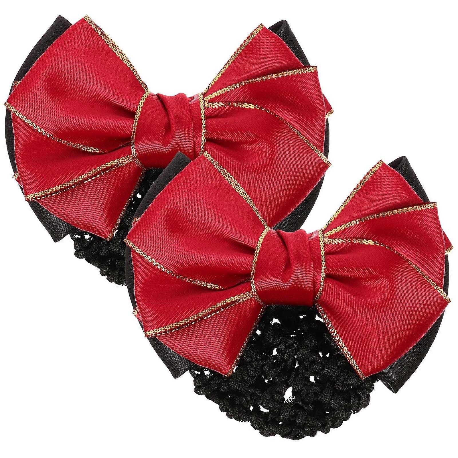 Eease 2Pcs Bowknot Hair Snoods Golden Tuck Net Headdress Occupational Hair Bun Net for Class Work Daily (Red)
