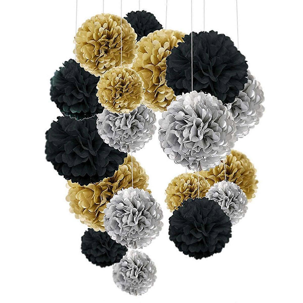 Paper pom-poms, black and gold pom-poms for wedding party decorations, 18 pieces