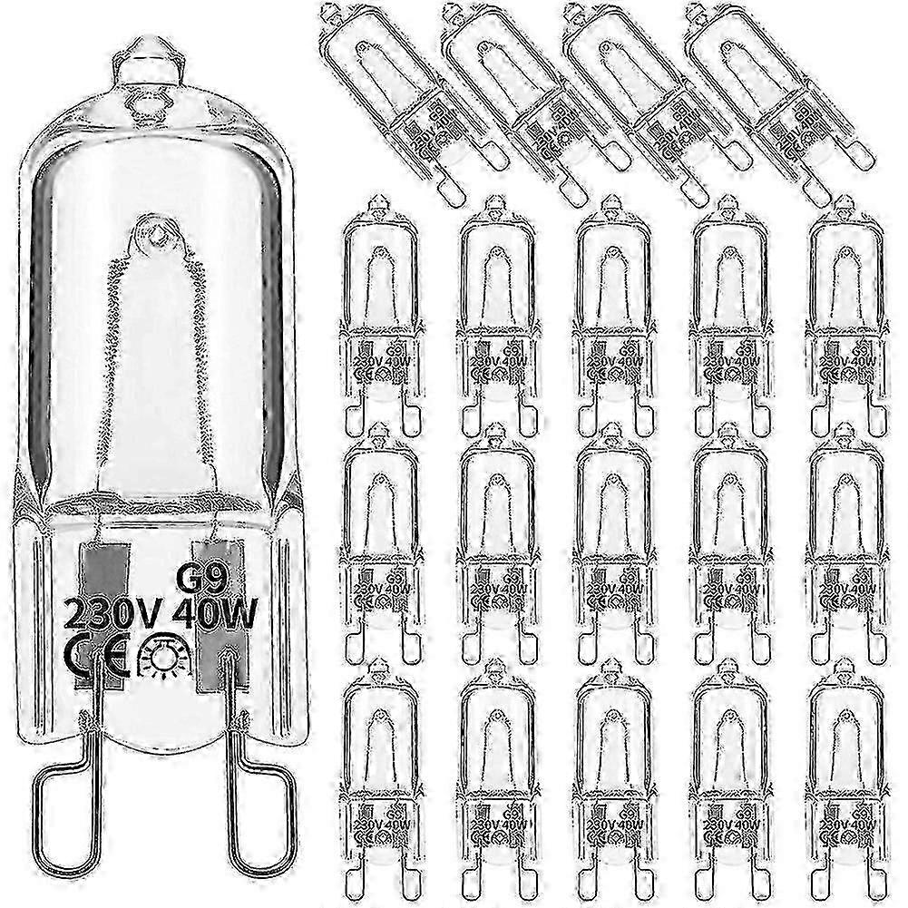 20Pcs G9 Halogen Light Bulbs,40W Clear Halogen Lamps Dimmable,Warm White 2800K for Chandeliers,Pend P20250110506 [Easy Installation]The halogen spot light bulbs are compatible with G9 base in 220-240 v, easy to install and replace the original ones.It is compatible with most LED dimmers, low heat generation, high brightness, no flicker, homogeneous light. [Wide Applications]Ceiling fan light: Uplights projects light up onto the ceiling, creating ambiance.Chandelier: Used as decorative points for rooms.Downlights enhances visibility inside the room. Create a cozy and warm white full glow ambient atmosphere. [High Quality]20 Pack G9 halogen bulbs, Flicker free, and no hum quite operation. No lead or mercury, no UV, great for the environment.Low energy halogen bulbs provide a beam angle of 360 Degrees, 900 lumens & 2800K warm white light. [Comfortable Light]Make your eyes feel comfortable at 2800K warm white temperatures. Do not emit harmful radiation. No UV or IR.Perfect for use in kitchens, living rooms, bedrooms and hallway. Perfect lighting source for crystal chandelier, table and floor lamps, bedside light, atmosphere lighting etc. [Long Lifespan]Halogen light bulbs can use 2,000 Hours, 1.8 Years with 3 Hour Daily Use. Note that keep the halogen ceiling lamp bulbs from oil.Non-blinking bulbs are great for the environment and home. Type: 40W Colour: Transparent Material: Plastic Package Contents: 20 x G9 halogen light bulbs Warm note: this halogen light bulb only can be applied at its rated voltage. Only the above package content, other products are not included. Note: Light and different displays may cause the color of the item in the picture a little different from the real thing. The measurement allowed error is +/- 1-3cm.