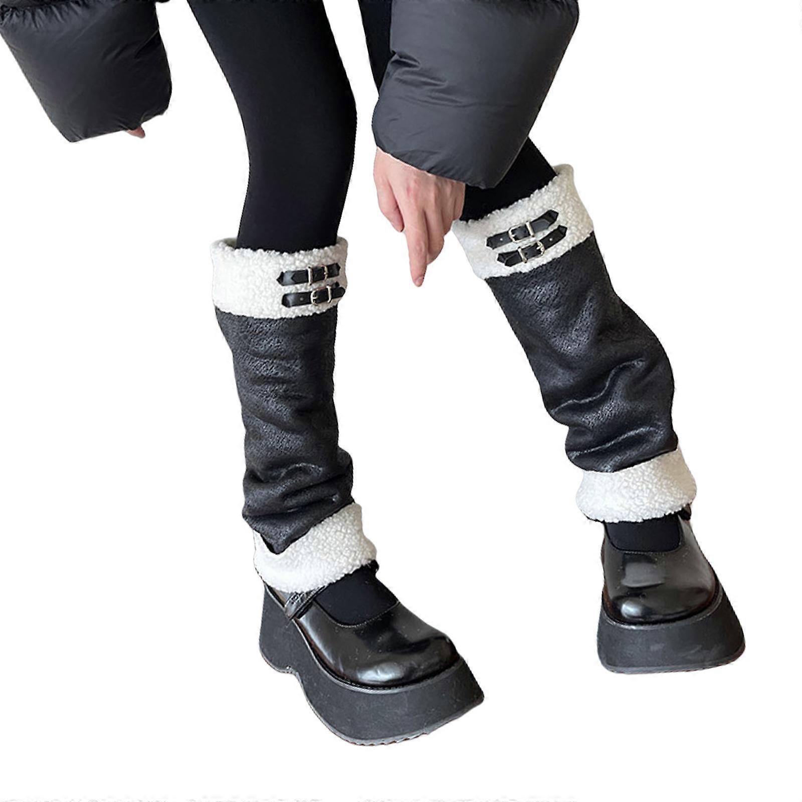 Women Winter Furry Trim Faux Leather Leg Warmers Calf Socks with Hairy Balls Bows Sweet Girl Japanese Fuzzy Boot Cuffs long belt buckle