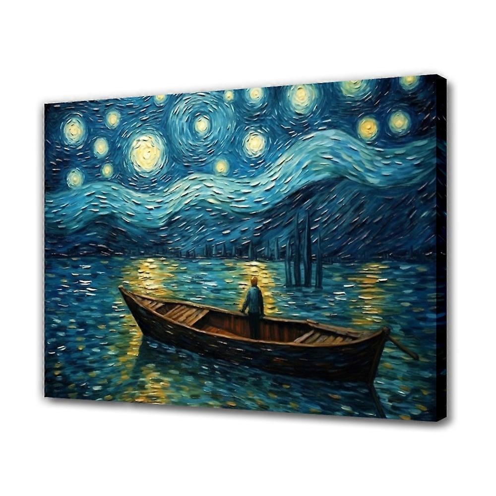 A Solitary Figure In A Boat Beneath A Starry Night Canvas Poster Bedroom Decor Sports Landscape Office Room Decor Gift,Frame-style,08x12inch(20x30cm)